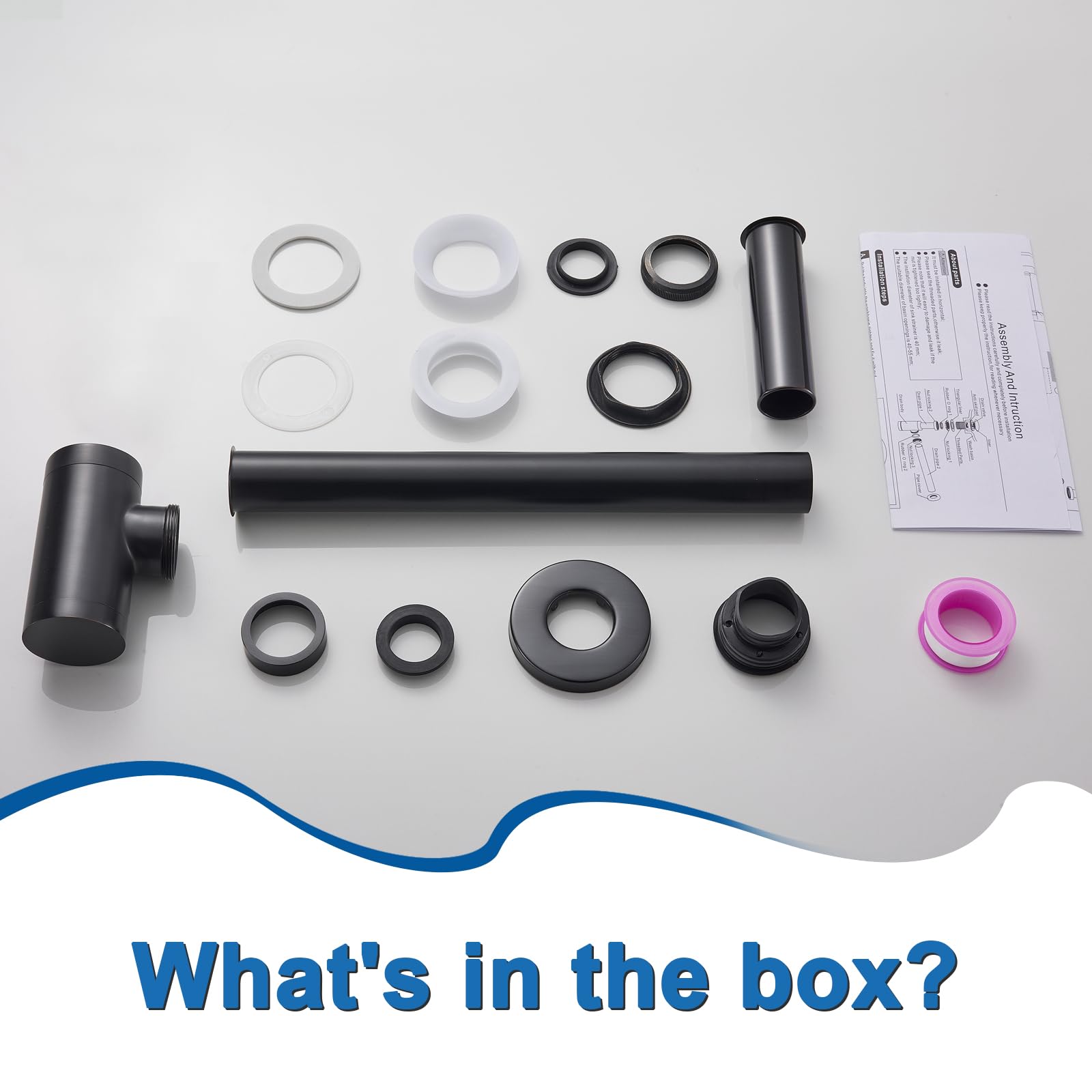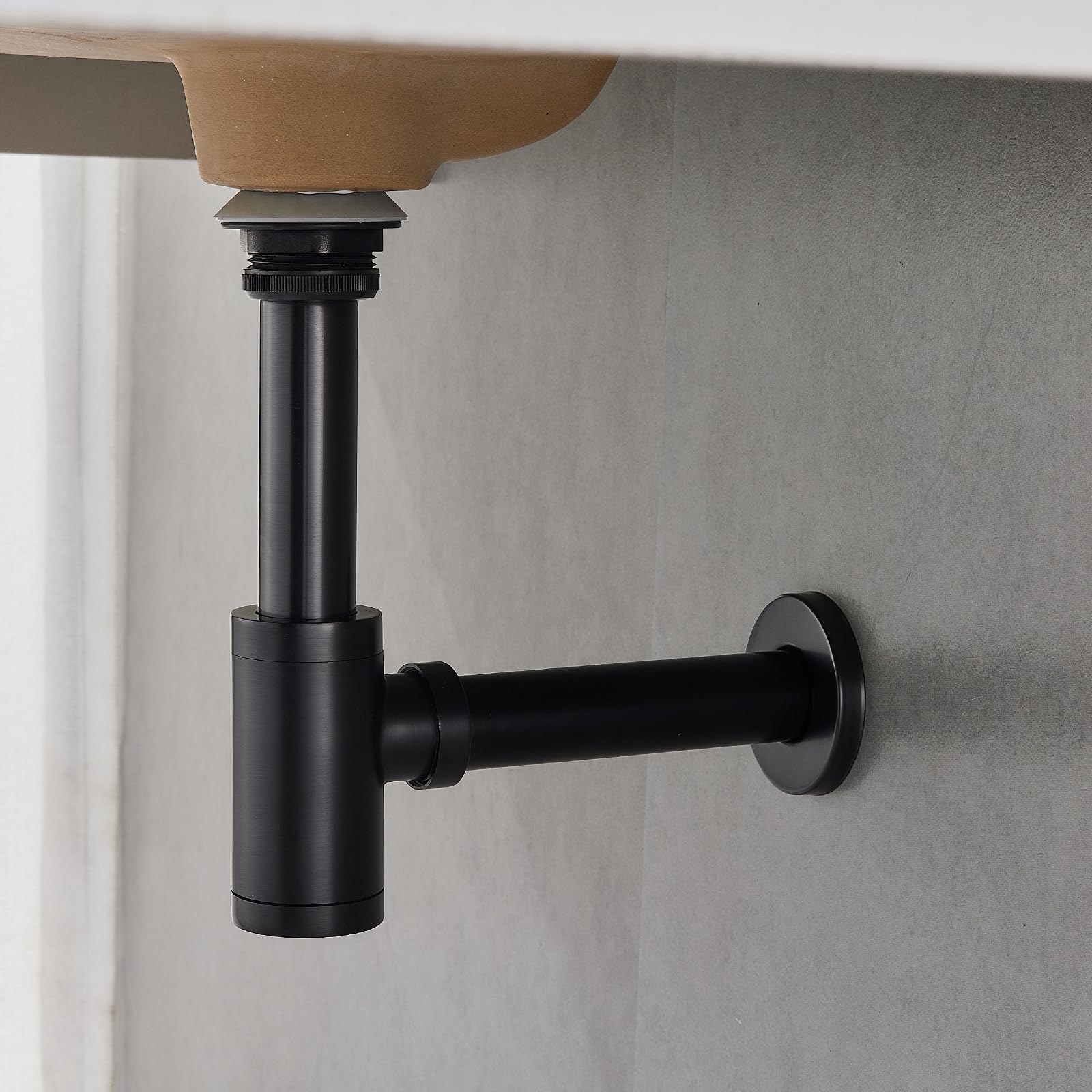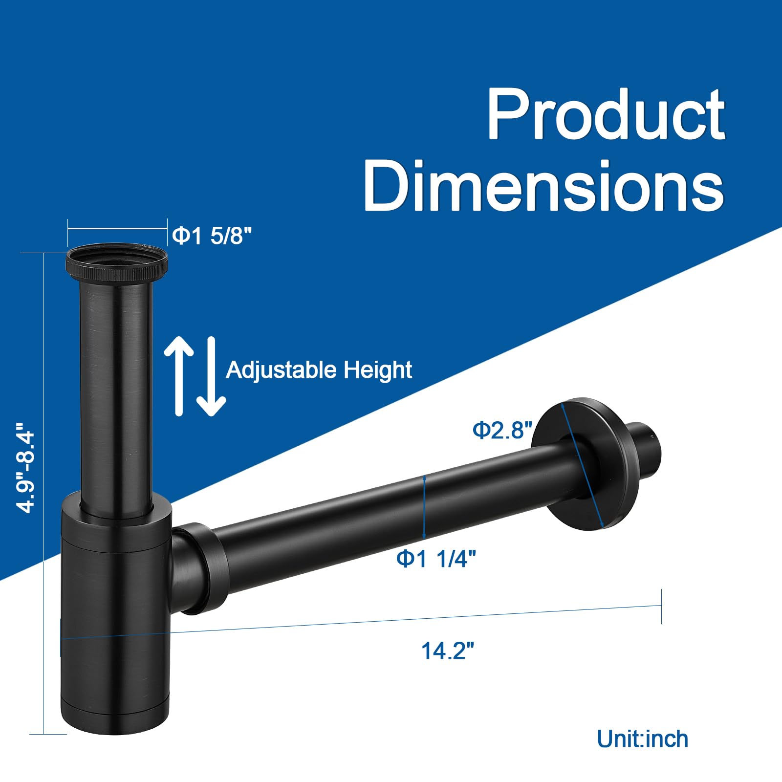 Specification Name Basin Bottle P-Trap/ Waste Pipe with Pop-up Drain Material P-Trap Made of Brass,Stainless Steel Pipe, Black Finished Modern design Works on your wall mounted sink, offers a decorative alternative to the traditional P-trap fittings in the exposed area under the lavatory, creates a good look in your restroom Bottle P-Trap Size Adjustable height 4.9 - 8.4 inch, Length (Fully Assembled): 14.2 inch, Fits 1.25" Diameter Inlet Pipe(standard 1 1/4" connections to basin waste) Flange Diameter: 2.3 inch Removable Trap for easy clean The bottle P-Trap meets plumbing code requirements in USA. Smooth interior will not easy to accumulate particulates debris and soap scum, cause buildup or bad odors.