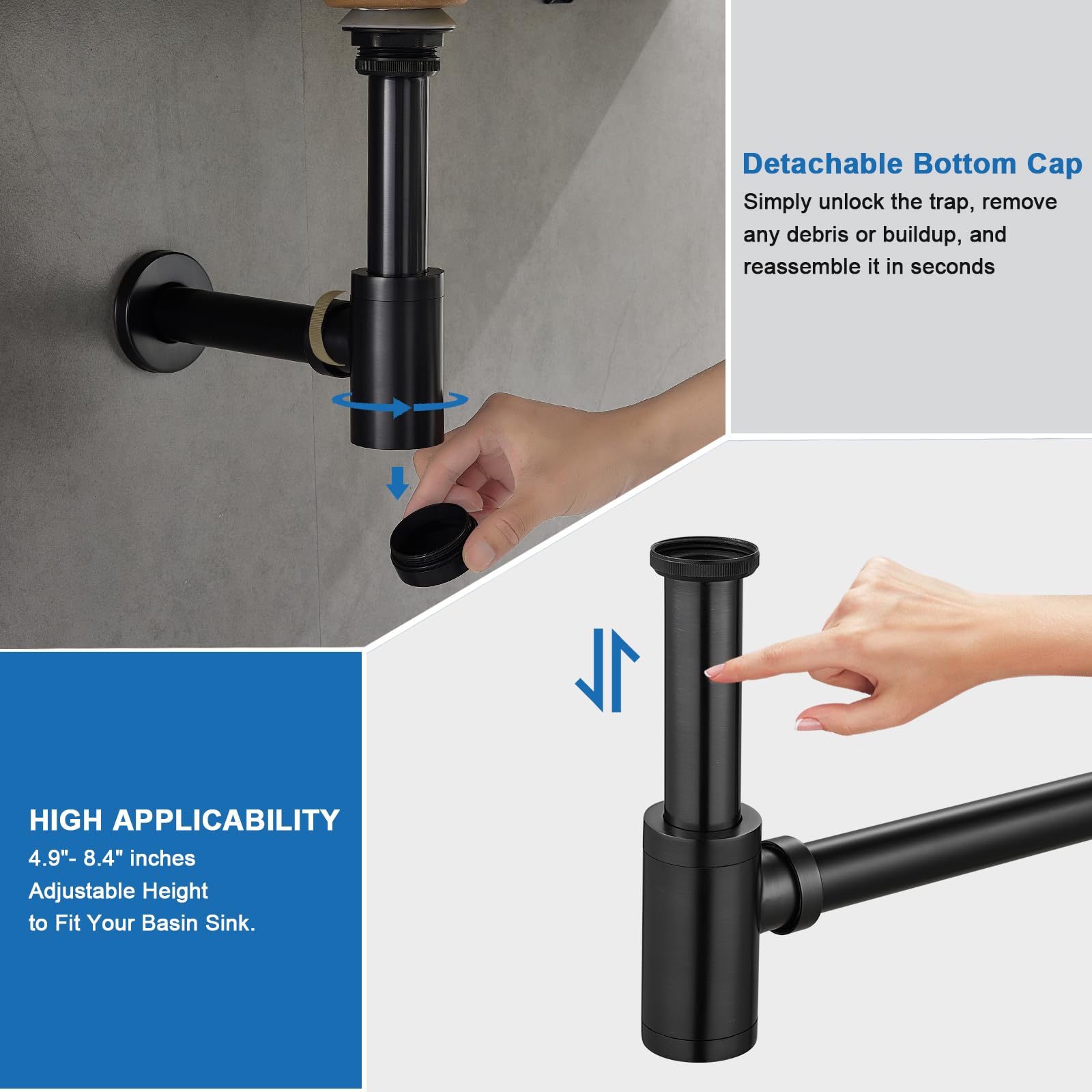 【High Applicability】The Sink Waste Trap Drain Kit is designed to fit the US plumbing standards with its 1-1/4" diameter slip inlet and 1-5/8" joint out. This means it can be easily installed and connected to most bathroom basin sinks without any hassle.