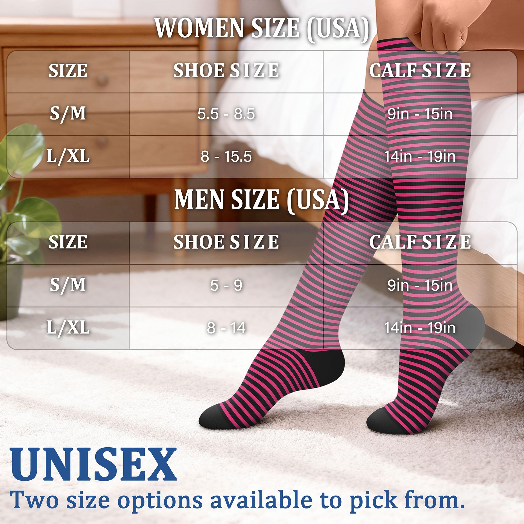 COMFORTABLE ALL-DAY WEAR: High performance fabric keeps an optimal calf and foot temperature with anti-itch wicking capabilities material. Features moderate compression 15-20 mmHg with arch and plantar support, can be comfortably worn all day and night. 100% Latex Free construction ensures comfort for sensitive skin
