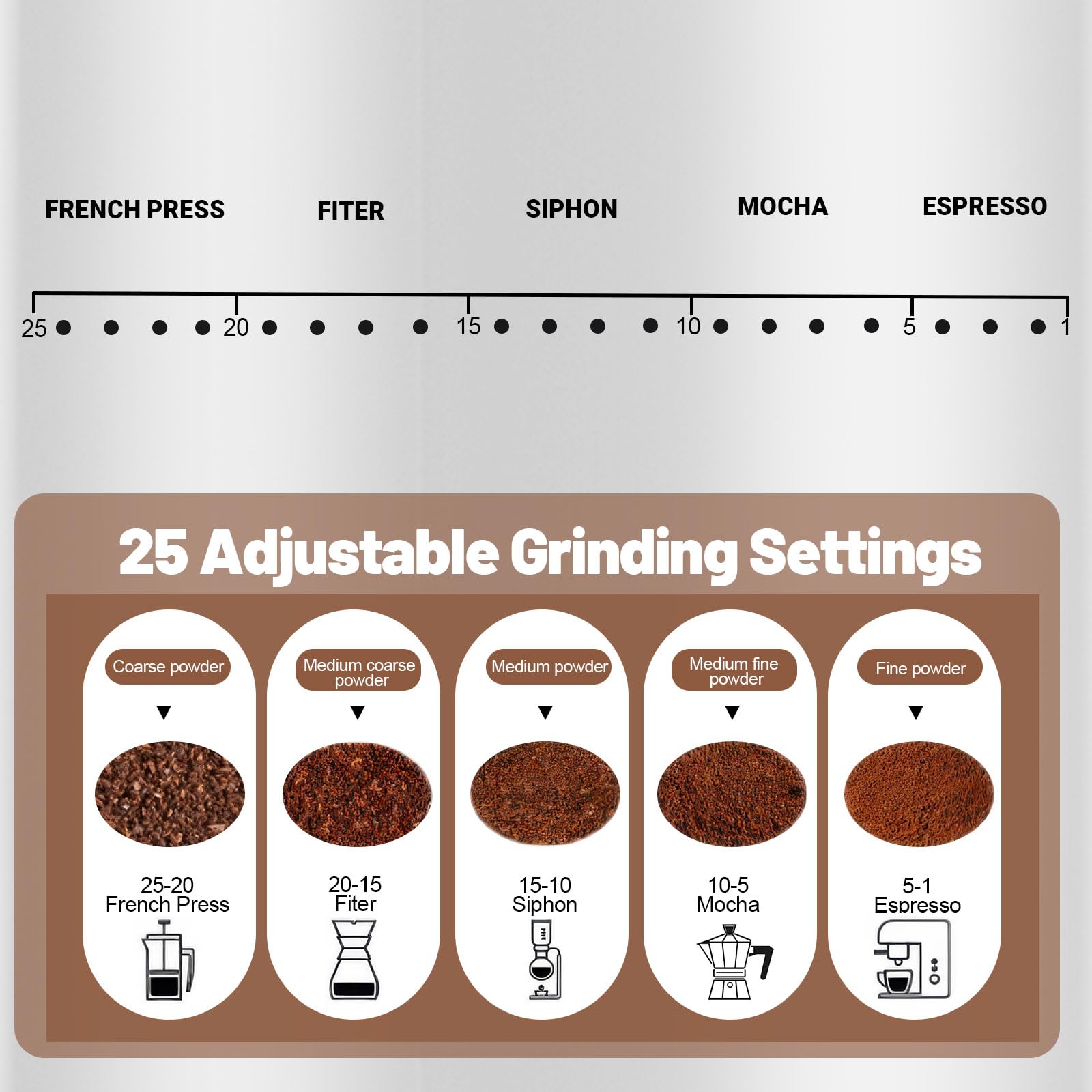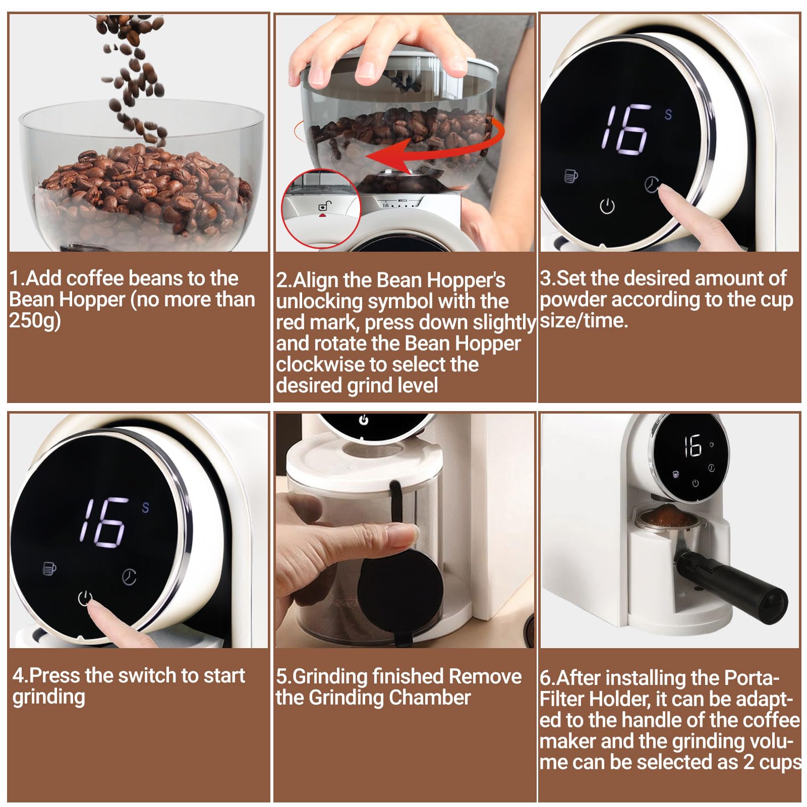 Effortless Electric Operation:Say goodbye to the laborious task of manual grinding. Our electric coffee grinder takes all the effort out of the process. With just a simple touch on the screen, it starts grinding the coffee beans quickly and efficiently. This electric operation is not only convenient but also ensures consistent results every time you use it(110V)
