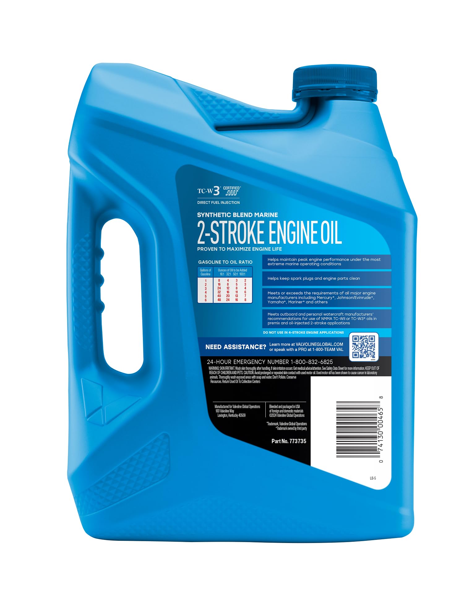 Valvoline 2-Stroke Outboard Marine Oil is specifically designed to help maintain torque and acceleration of water-cooled, high-revving outboard engines with pre-mix or direct injection systems. It also provides excellent performance in 2-stroke engines of motorcycles, all-terrain vehicles, snowmobiles and personal watercraft. Certified by the National Marine Manufacturers Association (NMMA) to meet or exceed outboard and personal watercraft requirements of top manufacturers, itβs recommended for use in both TC-WII or TC-W3, including premix and oil-injected 2-stroke applications. Pre-diluted for ease of mixing with gasoline, our formula may also be used in direct fuel injection systems. Our premium base stocks are blended with advanced additives and ashless detergent technology to help protect against corrosion and wear, minimizing combustion chamber deposits, ring sticking, cylinder scuffing, piston burning, port blocking and spark plug fouling. So you can spend more time enjoying the water and less time worrying about whatβs going on inside your engine.