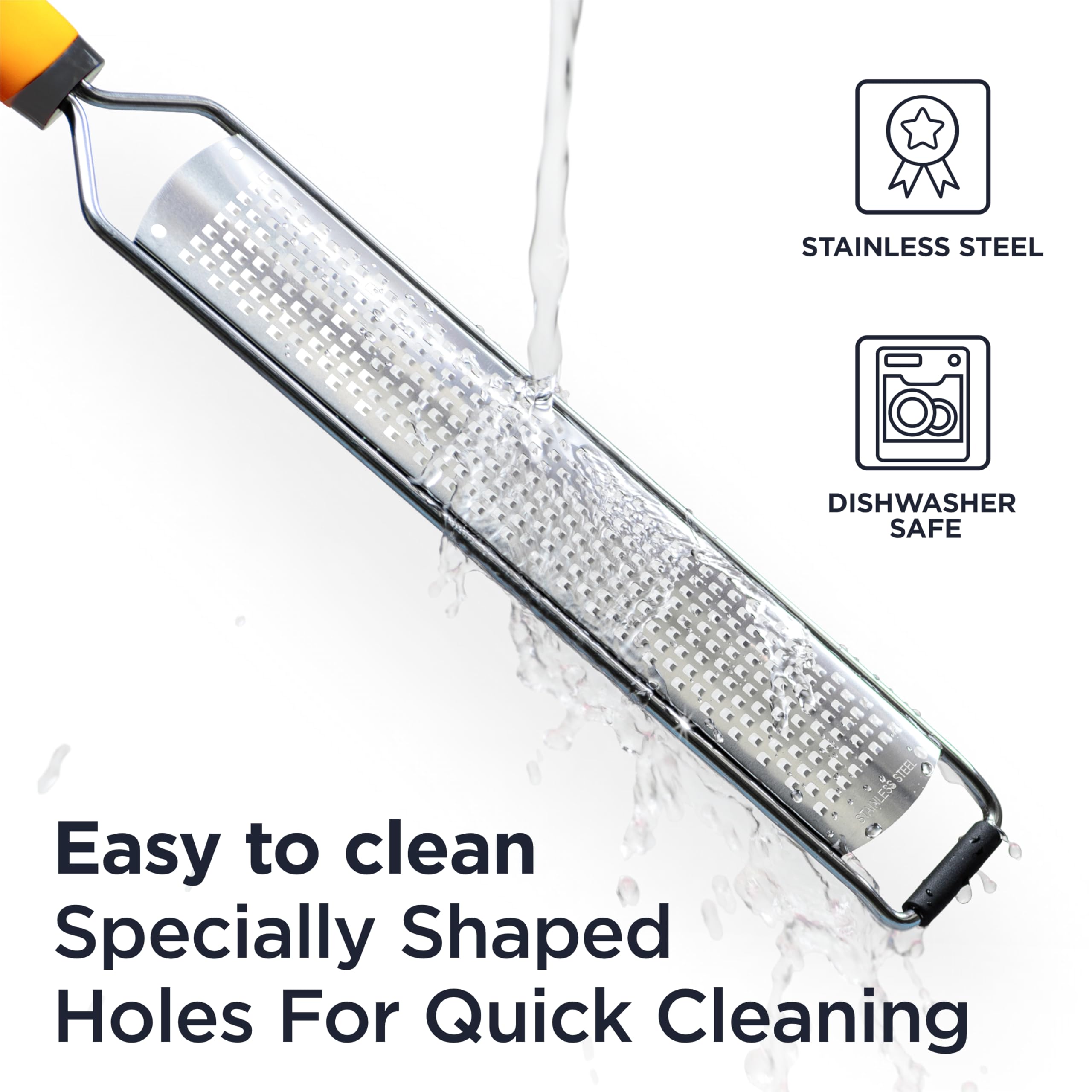 Zesting & Grating Have Never Been So Simple ✔ Shear the hardest cheese into grated fluff or get nicely shredded carrots using almost no pressure. Simply zip the zest grater cutter-knife across the rinds of oranges, lemons, and limes. In seconds, you can have finely grated garlic or ginger or treat yourself to a favorite dessert topped with fluffy chocolate flakes.