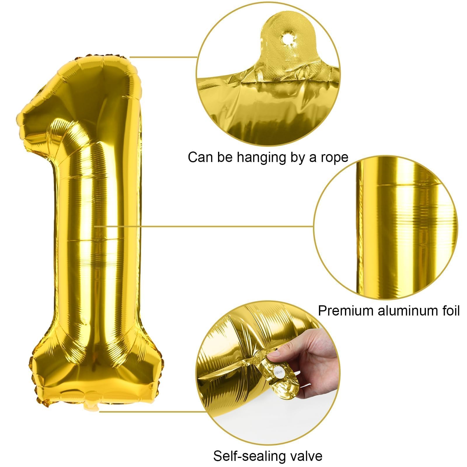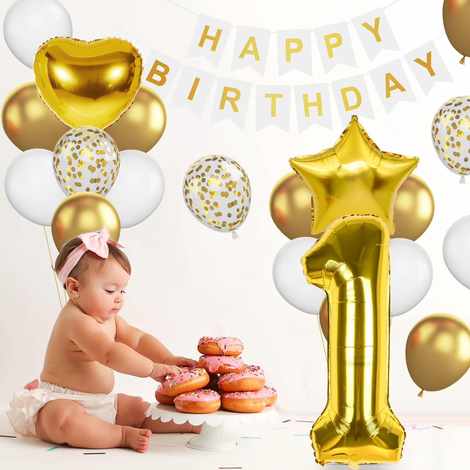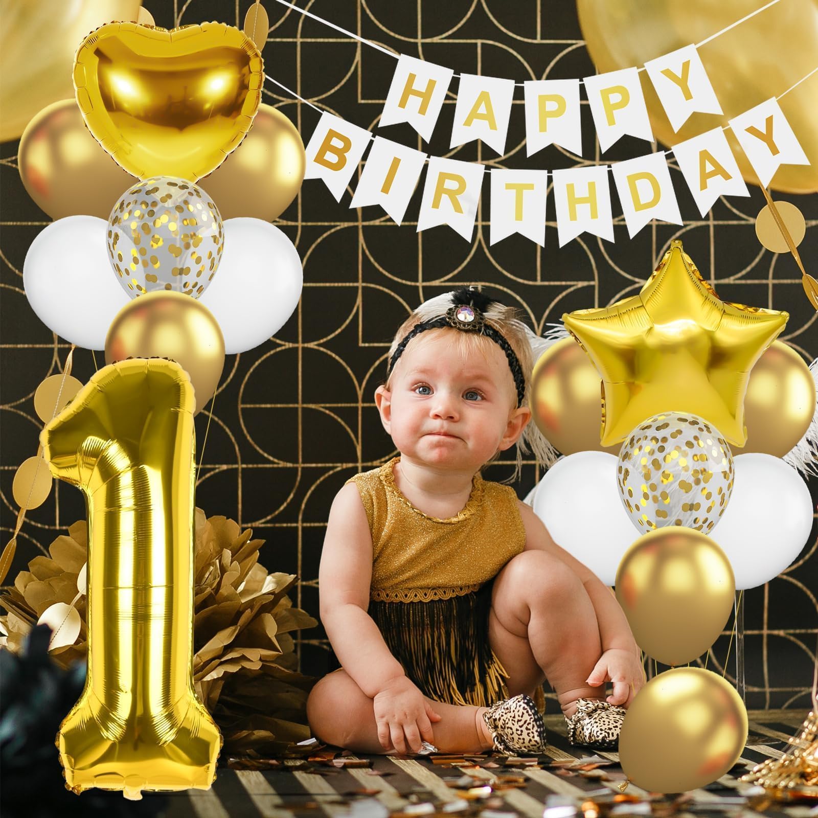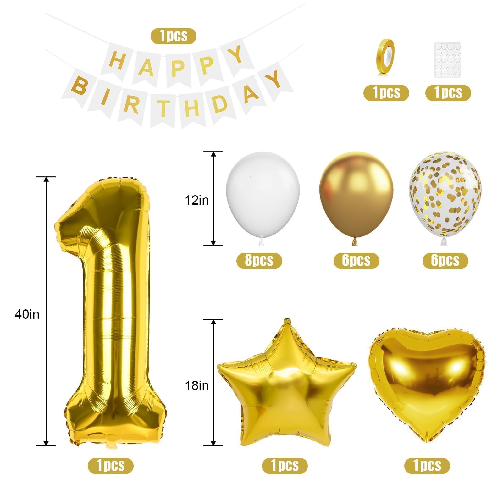 Gold 1st Birthday Decorations - You will get 1pc gold HAPPY BIRTHDAY banner, 1pcs 40 inch number 1 foil balloon, 1pcs gold star foil balloon, 1pcs gold heart foil balloon, 8pcs 12 inch white party balloons, 6pcs 12 inch Metallic gold balloons, 6pcs 12inch gold confetti helium balloons, 1pc gold ribbon. Beautiful combination to meet the needs of your child's birthday party. Big number balloons are the perfect decoration for birthday party.