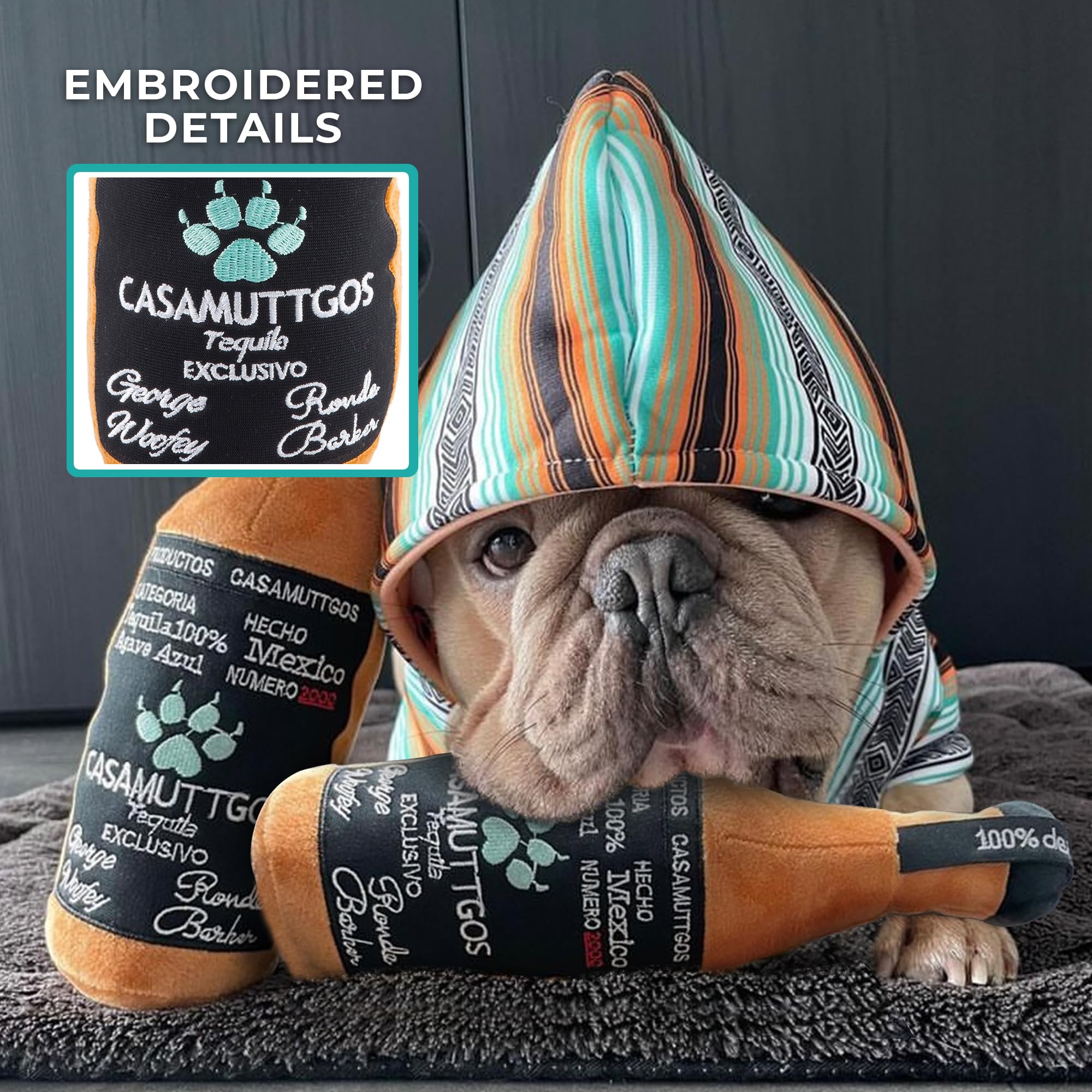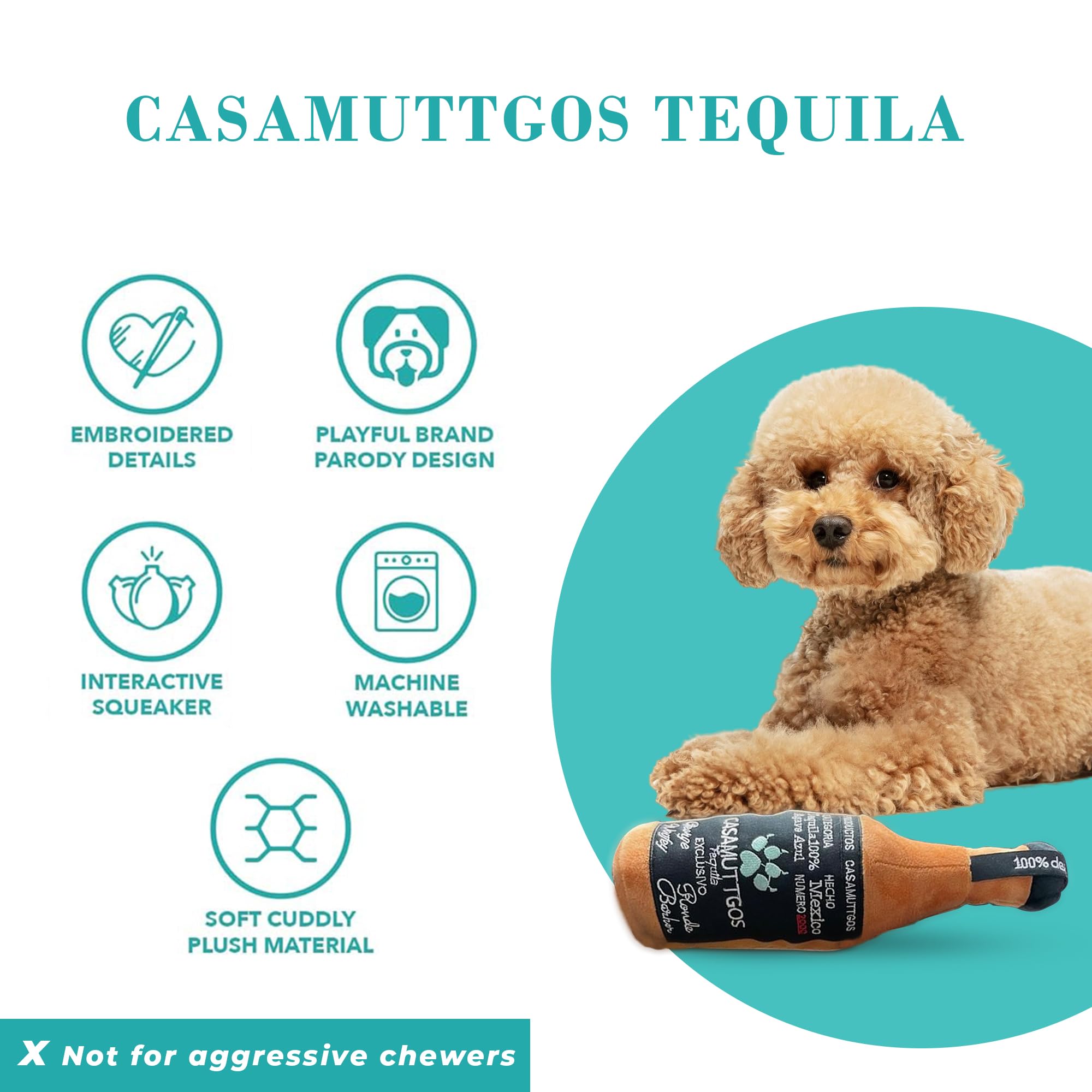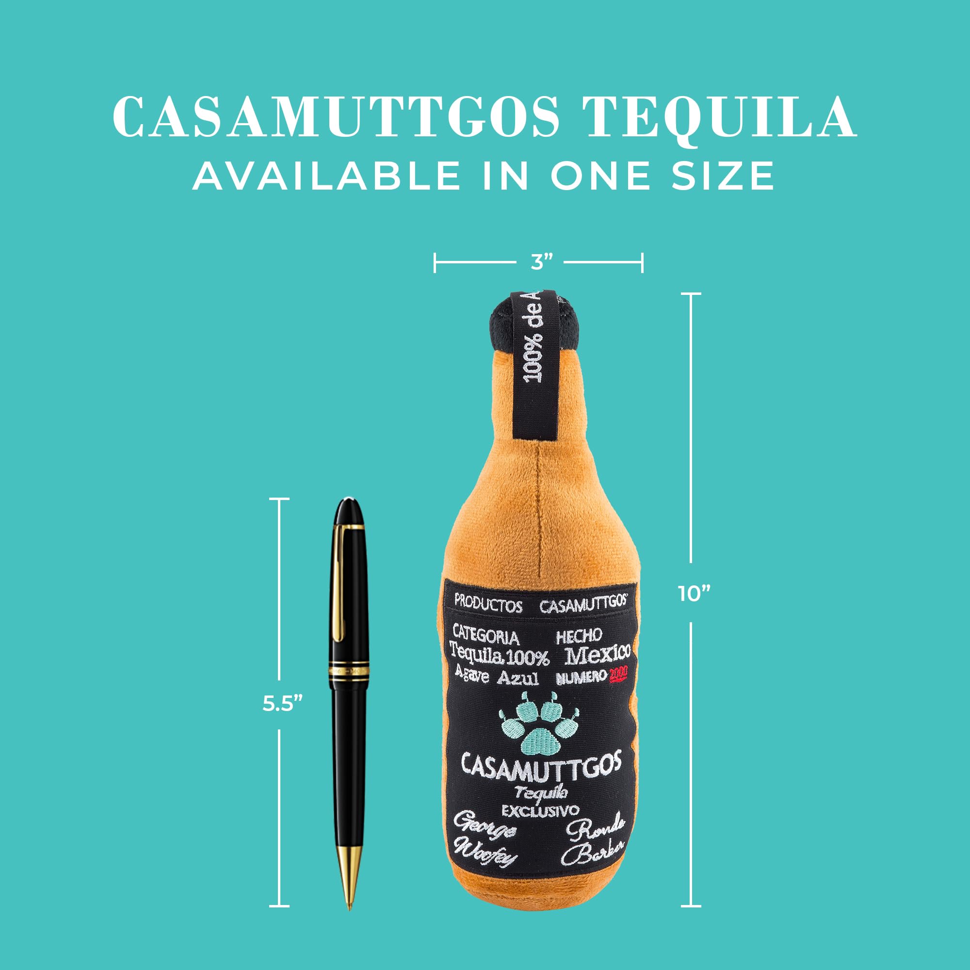 Funny Parody Plush Dog Toy: Upgrade your pups Muttini Bar with this top-shelf Casamuttgos Tequila dog toy. This dog toy features a brown and black exterior with a built-in squeaker hidden inside. It’s a fun, cute interactive dog toy that turns every playtime into happy hour! One Size 10”x4.5"x3".