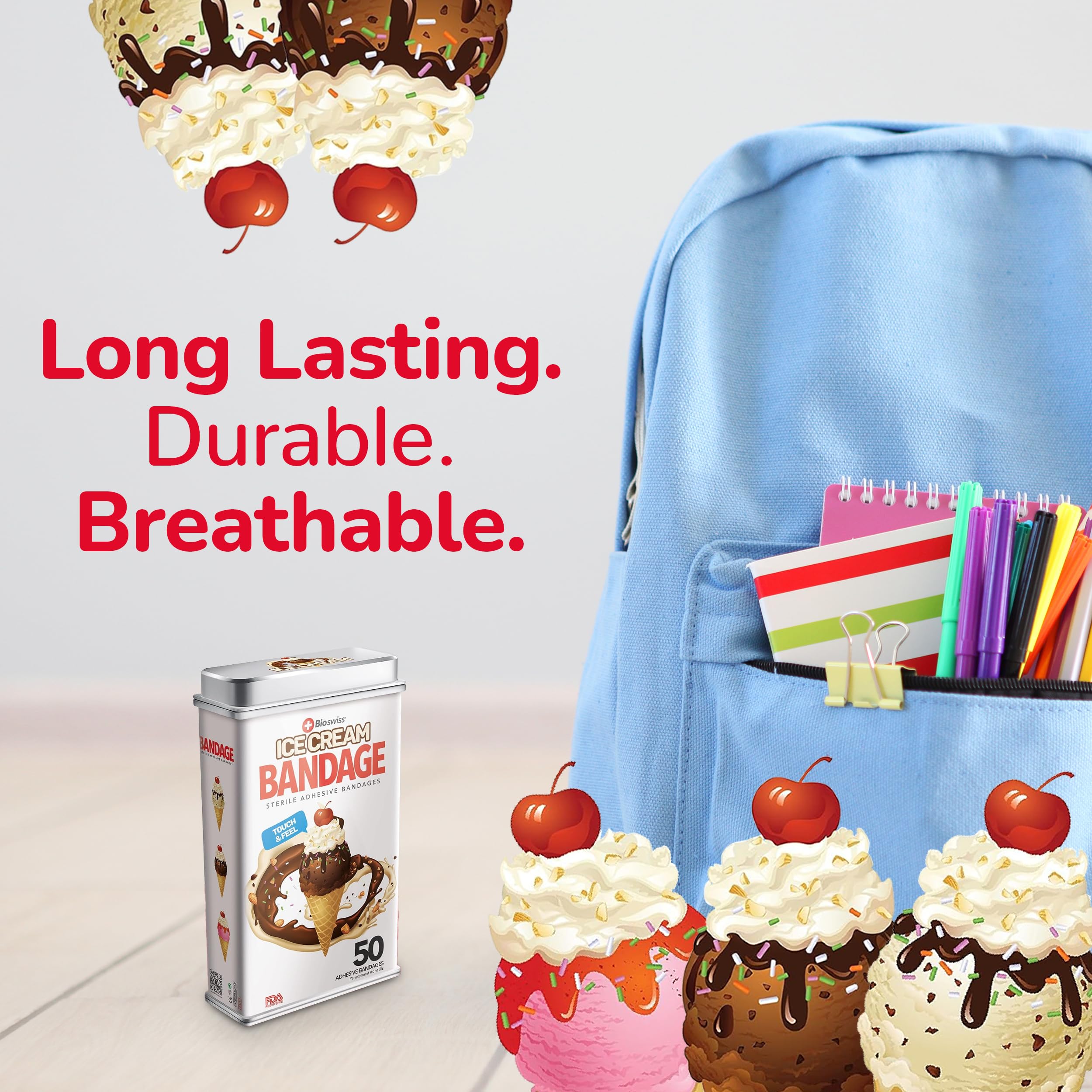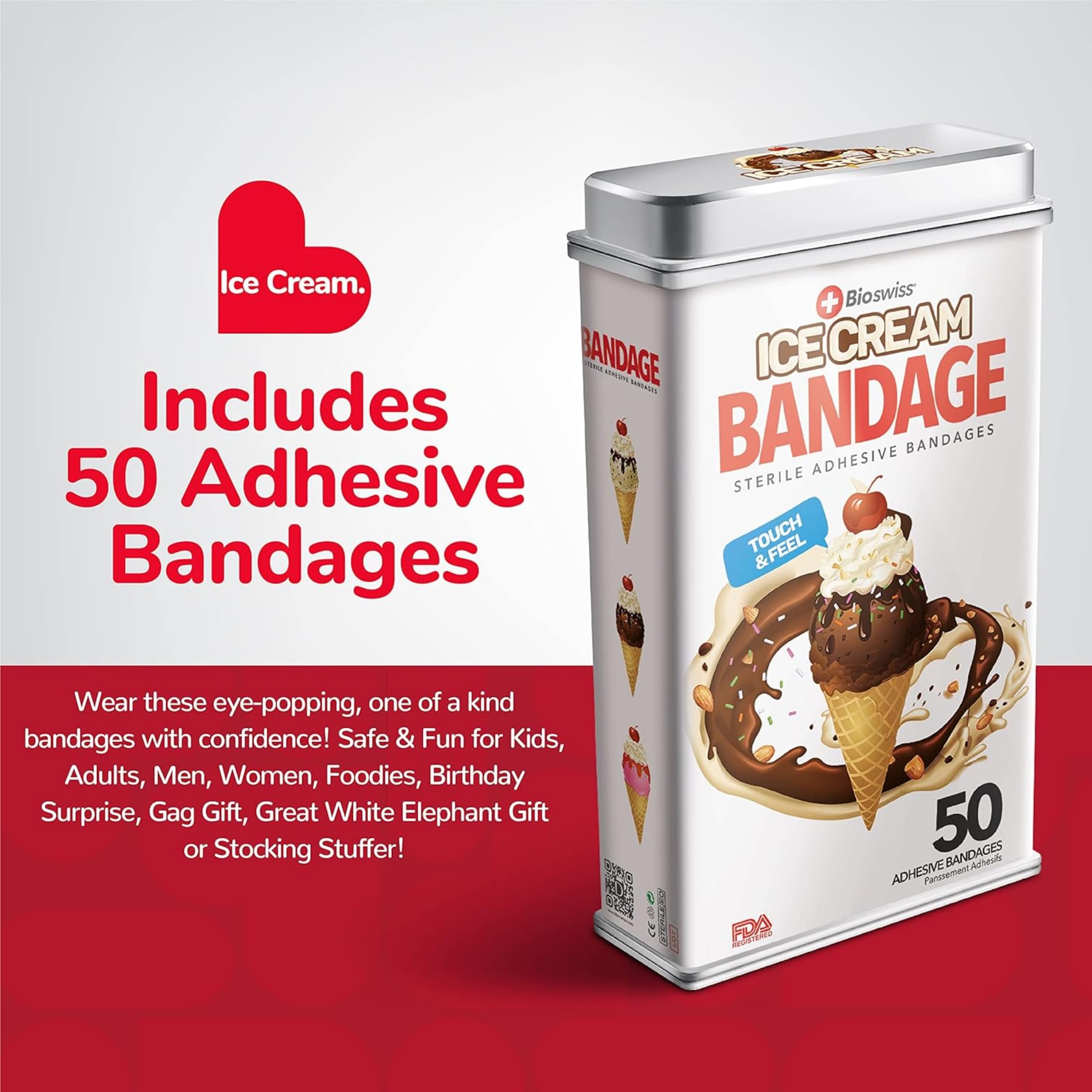 ICE CREAM BANDAGES: This 50 piece tin of adorable and delicious looking ice cream bandages is great for putting a smile on kids' faces while protecting wounds such as cuts, scrapes, and burns; sticky bandages are perfect for kids and adults alike, and also for school nurses and pediatric doctors
