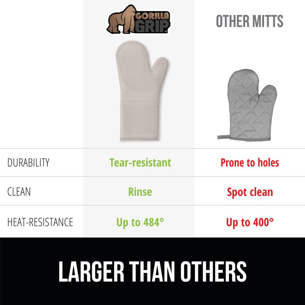 WATERPROOF AND STAIN RESISTANT: no more constantly stained oven mitts; Gorilla Grip Silicone Mitts are both stain resistant and waterproof; spills can easily and instantly be rinsed away under water; hot liquids won’t soak through and scald your skin as they would with other materials