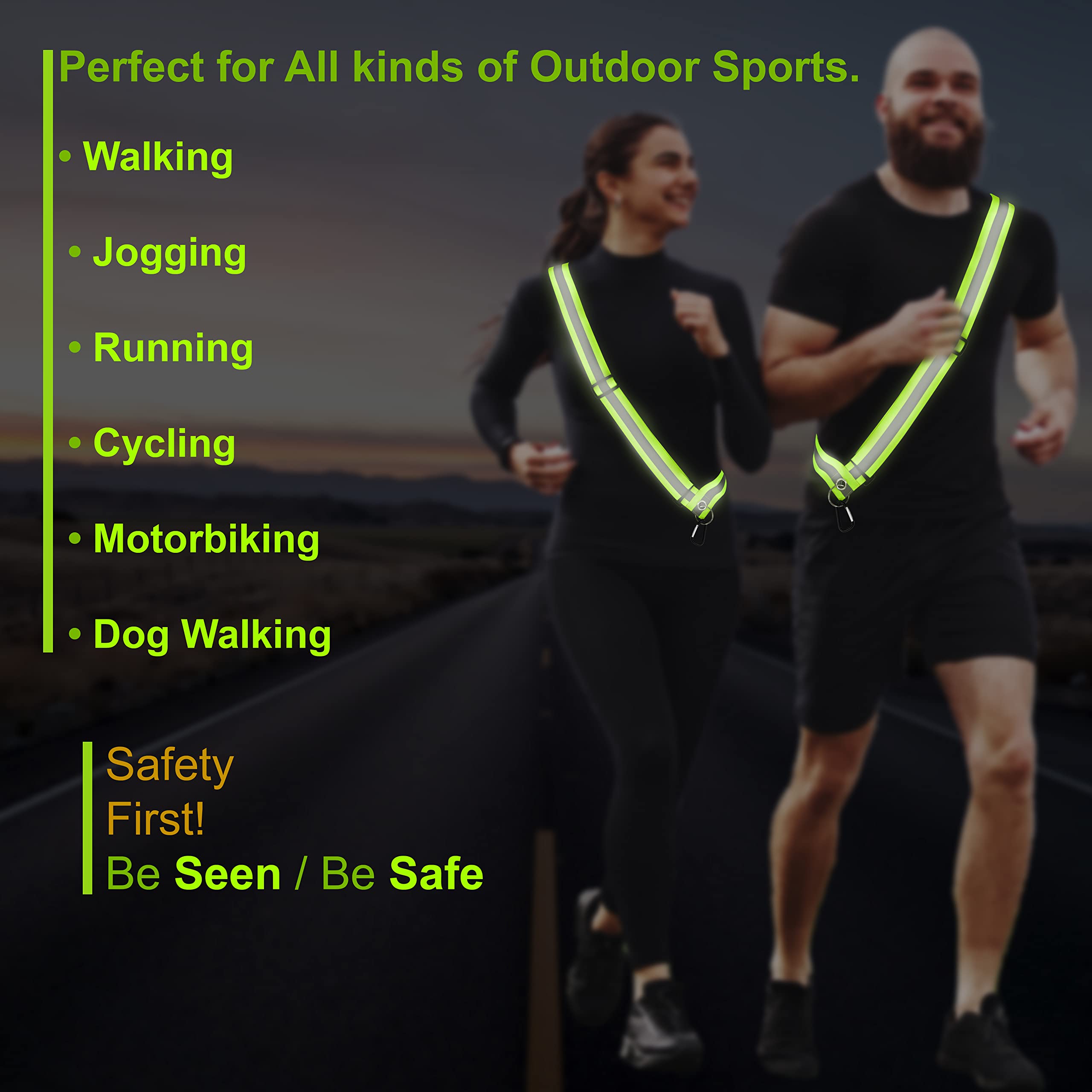 High-visibility reflective design: Made from high-visibility reflective material, our 360-degree safety reflective sash ensures you're seen from up to 800 feet in all weather conditions, including night, rain, and fog, making it an essential safety accessory for outdoor activities
