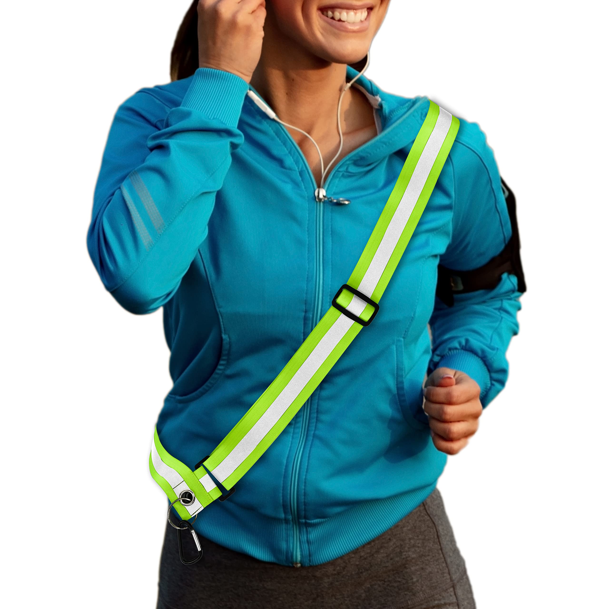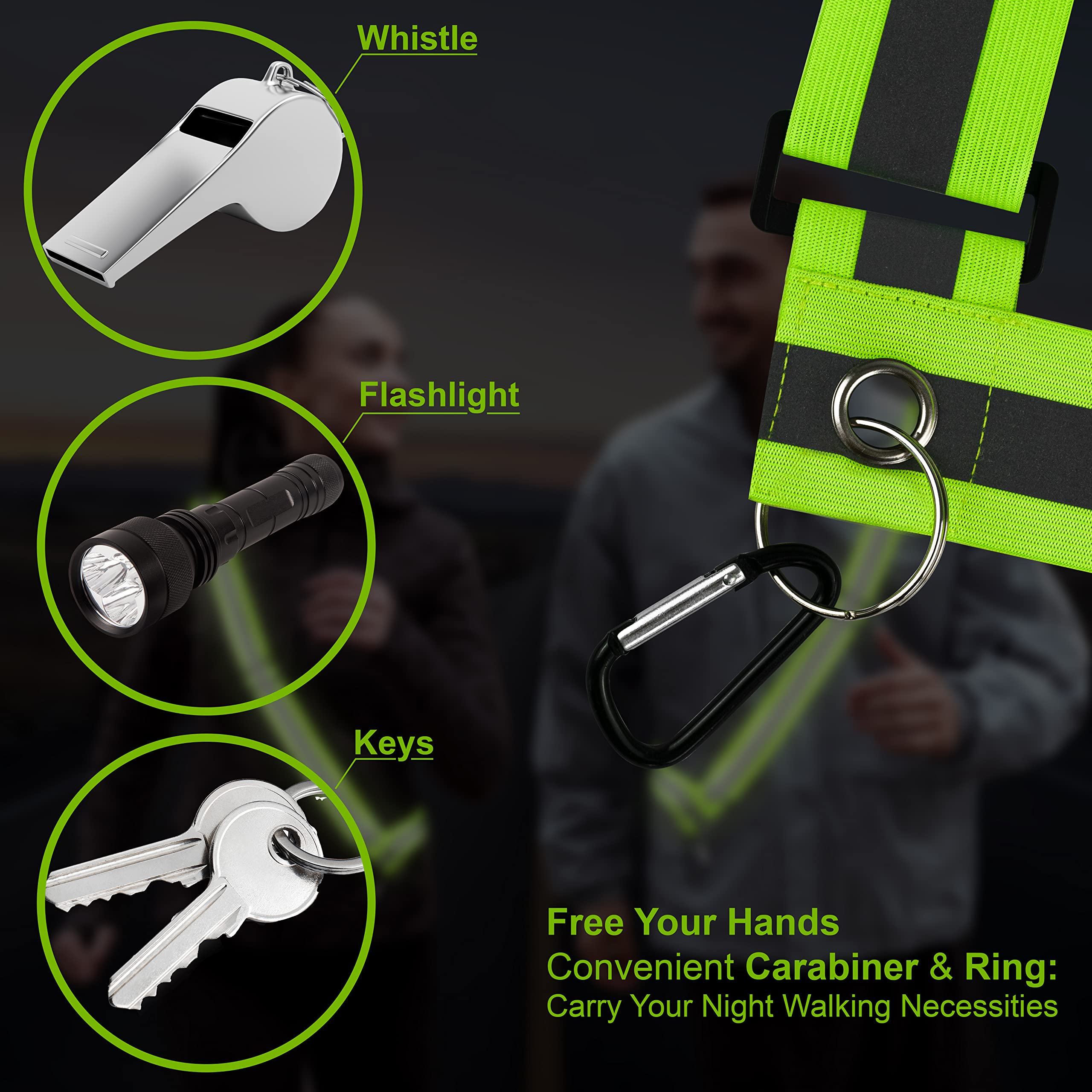 Multipropósito y funcional: Nuestro equipo reflectante para caminar por la noche es ideal para correr, andar en bicicleta, caminar y otros deportes nocturnos. La correa reflectante para el hombro presenta un diseño cruzado con un llavero y mosquetón multifuncional, lo que permite una conveniencia manos libres con accesorios como llaves, bolsas de desechos o una linterna