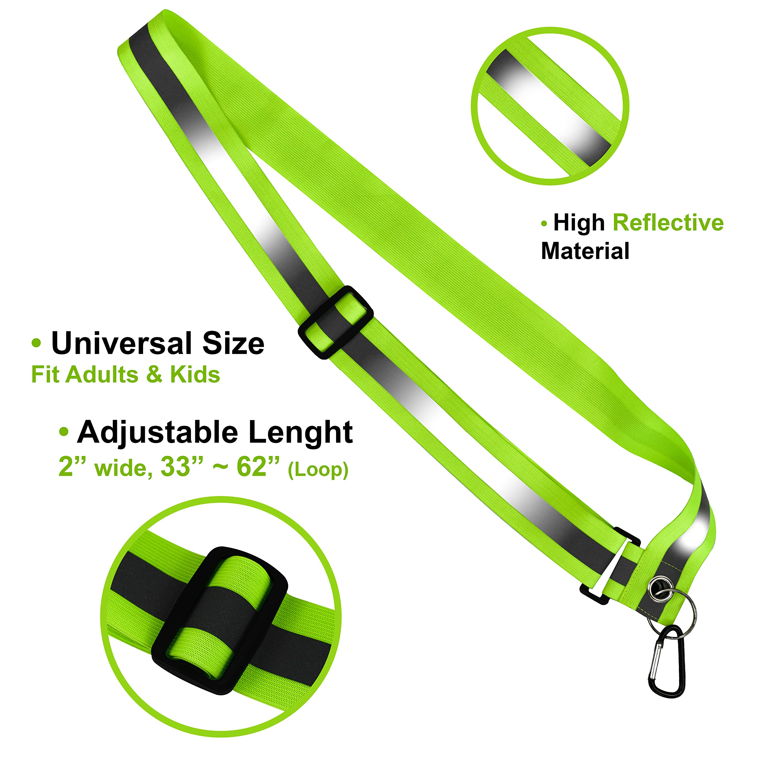 Ajustable y cómodo: Este cinturón reflectante ligero es fácilmente ajustable para adaptarse a niños, mujeres u hombres sobre cualquier prenda de vestir, lo que lo hace perfecto para usar con camisetas, jerseys o chaquetas durante cualquier actividad