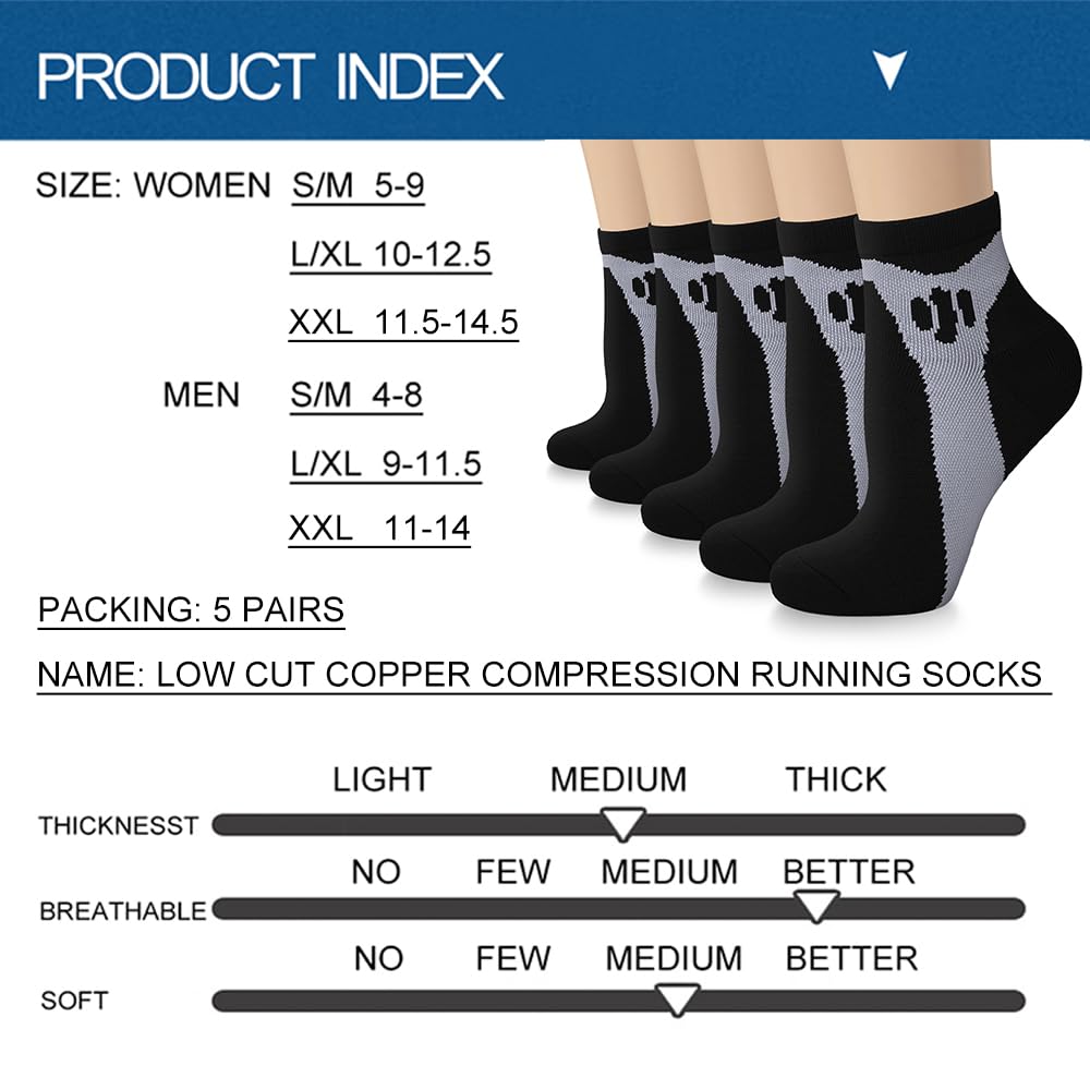 Copper Ankle Compression Socks – Designed with 15-20 mmHg graduated compression, these low cut compression socks help support circulation, ease swelling, and provide lasting comfort for running, work or daily use
