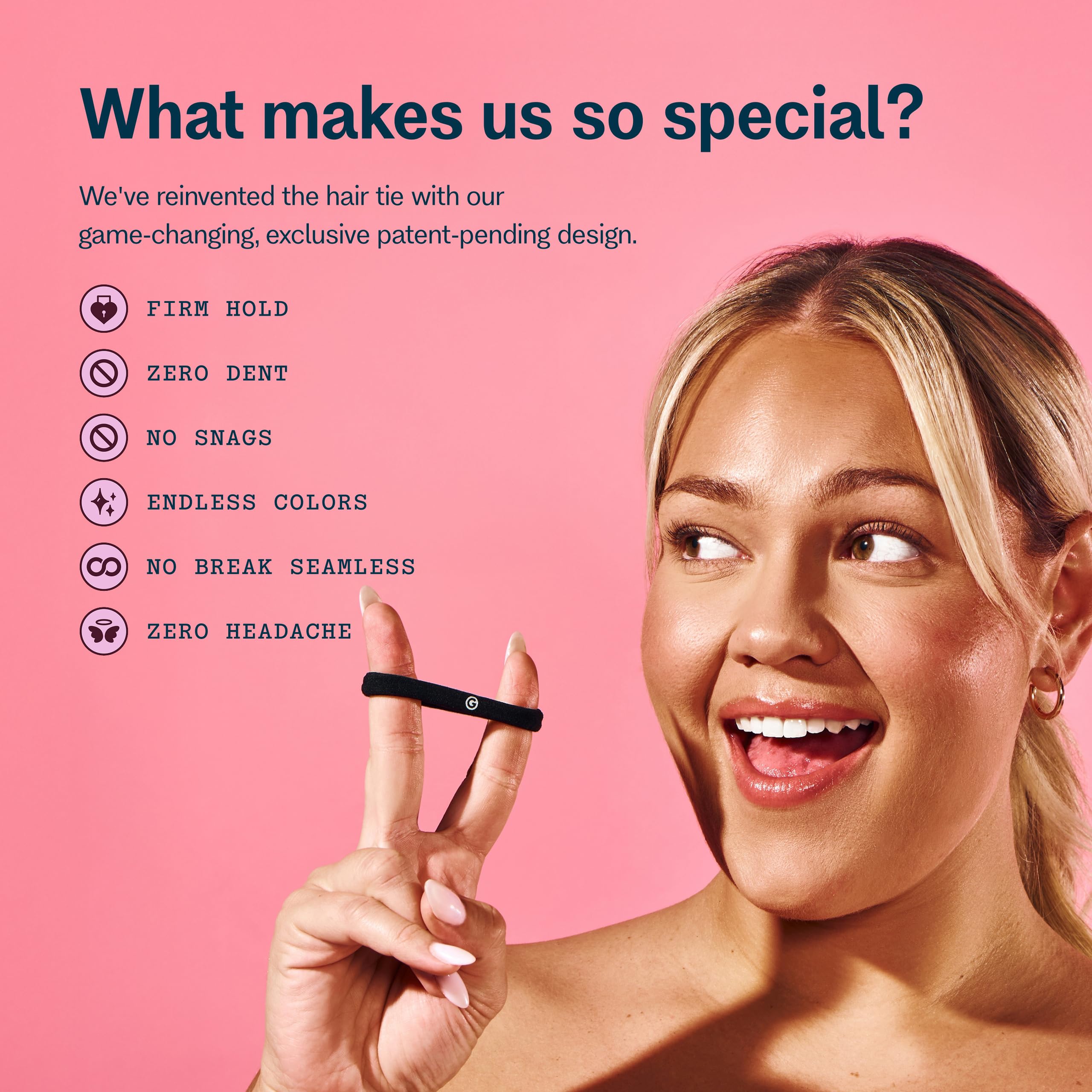 Introducing the perfect solution for fine, brittle, or bleached hair with Gimme Beauty Fine Hair Elastic Bands. These innovative hair ties feature a patent-pending design specifically engineered to provide a gentle yet secure hold while helping protect your delicate strands throughout the day.These nylon and spandex hair bands are thoughtfully crafted with seamless construction to help prevent common styling discomforts like headaches and hair dents. The specialized stretch-to-fit technology works to maintain a comfortable grip while being gentle enough as an everyday-use hair tie, making them ideal for creating lasting hairstyles without compromising hair health.Each elastic in this pack features a unique blend of nylon, silk, and spandex materials that helps provide snag-free styling versatility. Whether you're securing a ponytail, finishing off a braid, or creating everyday hairstyles, these hair ties offer the perfect combination of flexibility and hold for fine hair types.At Gimme Beauty, we believe hair solutions aren't one size fits all. We understand that each person's hair journey is unique, which is why we've designed these hair ties to work for all hair types, helping you feel confident and unstoppable in your daily life.We celebrate the sisterhood that grows from our shared experiences with hair. While some brands focus on exclusivity, we believe in creating accessible, inclusive products that work for everyone. Our mission goes beyond hair accessories—we're here to amplify your confidence because we know that confident women are unstoppable.