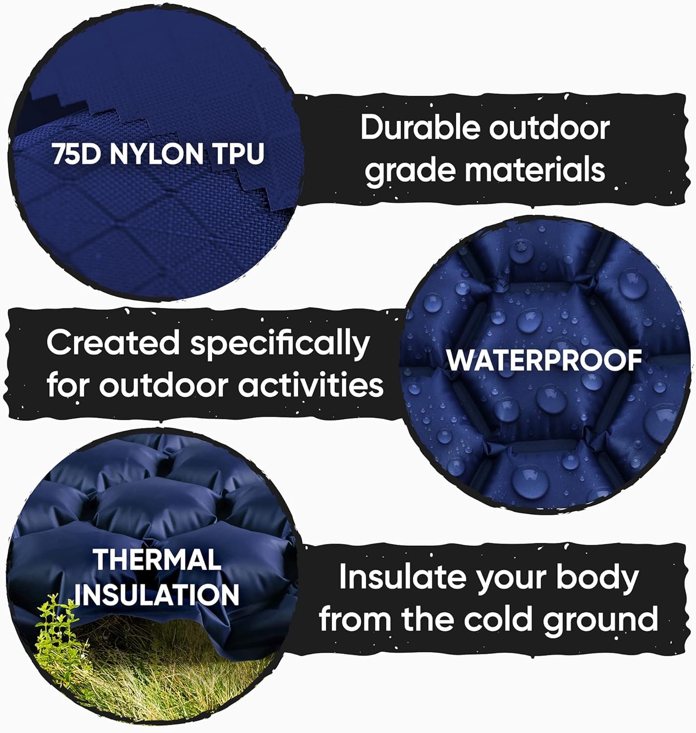 UNIQUE LONGLASTING DURABILITY: It's the mat of all mats! The inflatable sleeping pad is made of durable, outdoor grade materials. It includes thermal insulation, to keep your body warm from the cold winter ground. Our camping sleeping mat is 100% waterproof, making it perfect for any outdoor activities. You can say goodbye to sore backs and other discomforts normally left by bumps and rocks underneath the floor of your tent!