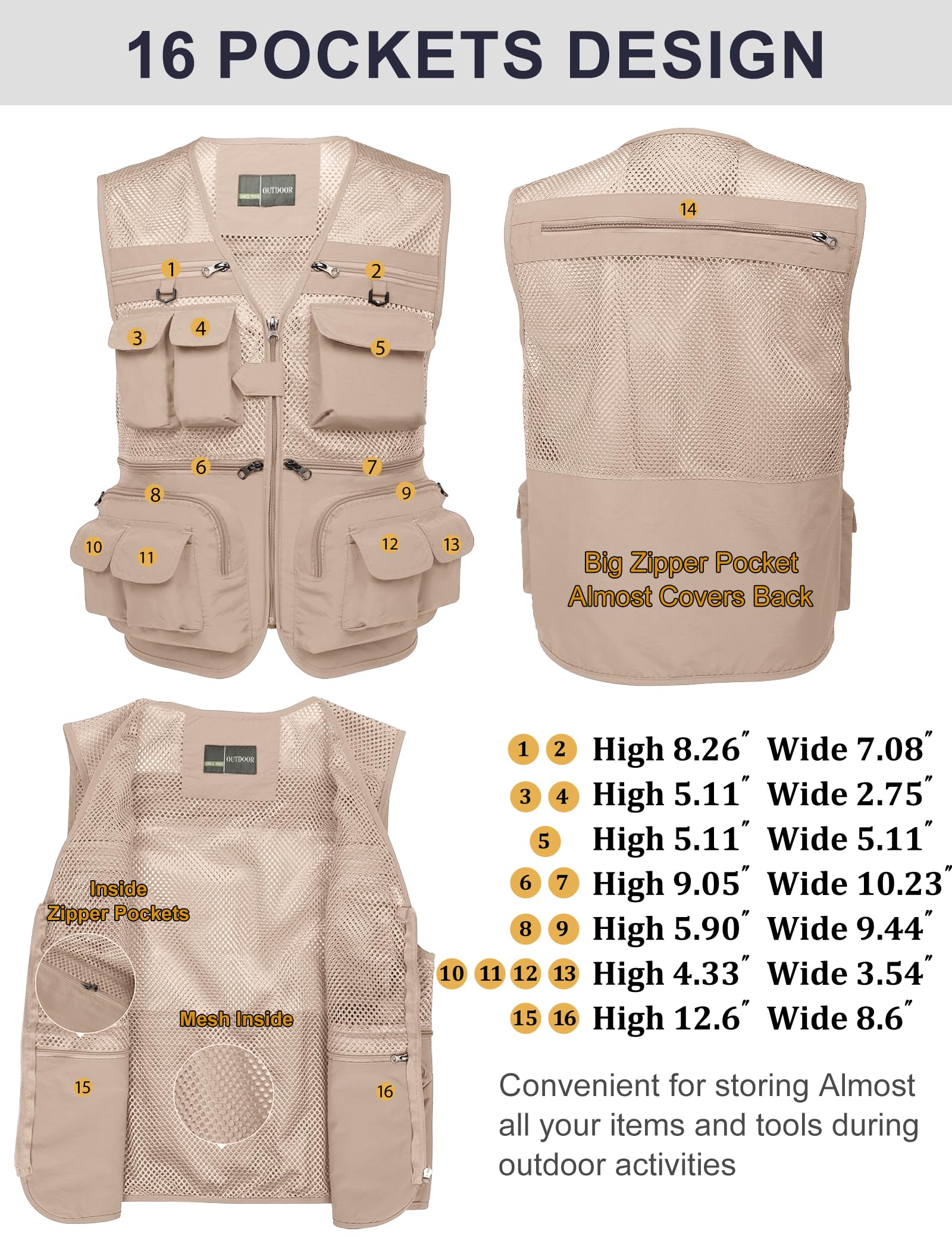 【16 Functional Pockets for All Your Gear】Equipped with 16 varying-sized pockets (including secure zippered & velcro-fastened ones), this vest keeps your essentials organized—cell phone, keys, fishing tackle, camera lenses, tools, and wallet—all within easy reach. Free your hands to focus on fishing, photographing, or exploring