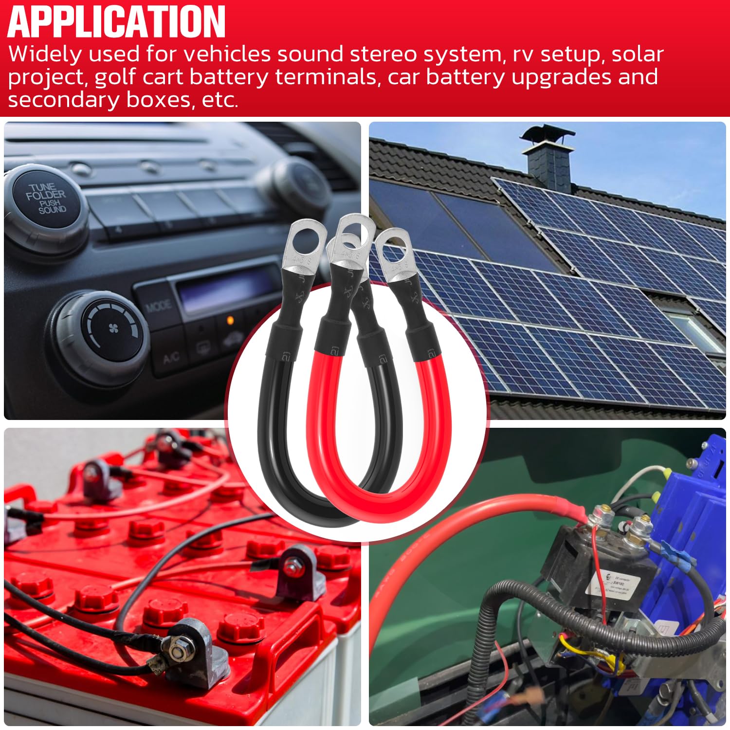 You can use these battery cables for replacement automotive, motorcycle, RV, camper, travel trailer and other vehicle wiring applications, grounding cables, golf carts, car audio stereo amplifiers, solar and many other DC applications Package included: 1 black+1 red cable Note: Please carefully chack all the product information to make sure this will fit your original unit Any questions, please tell us, we’ll answer you as quick as possible