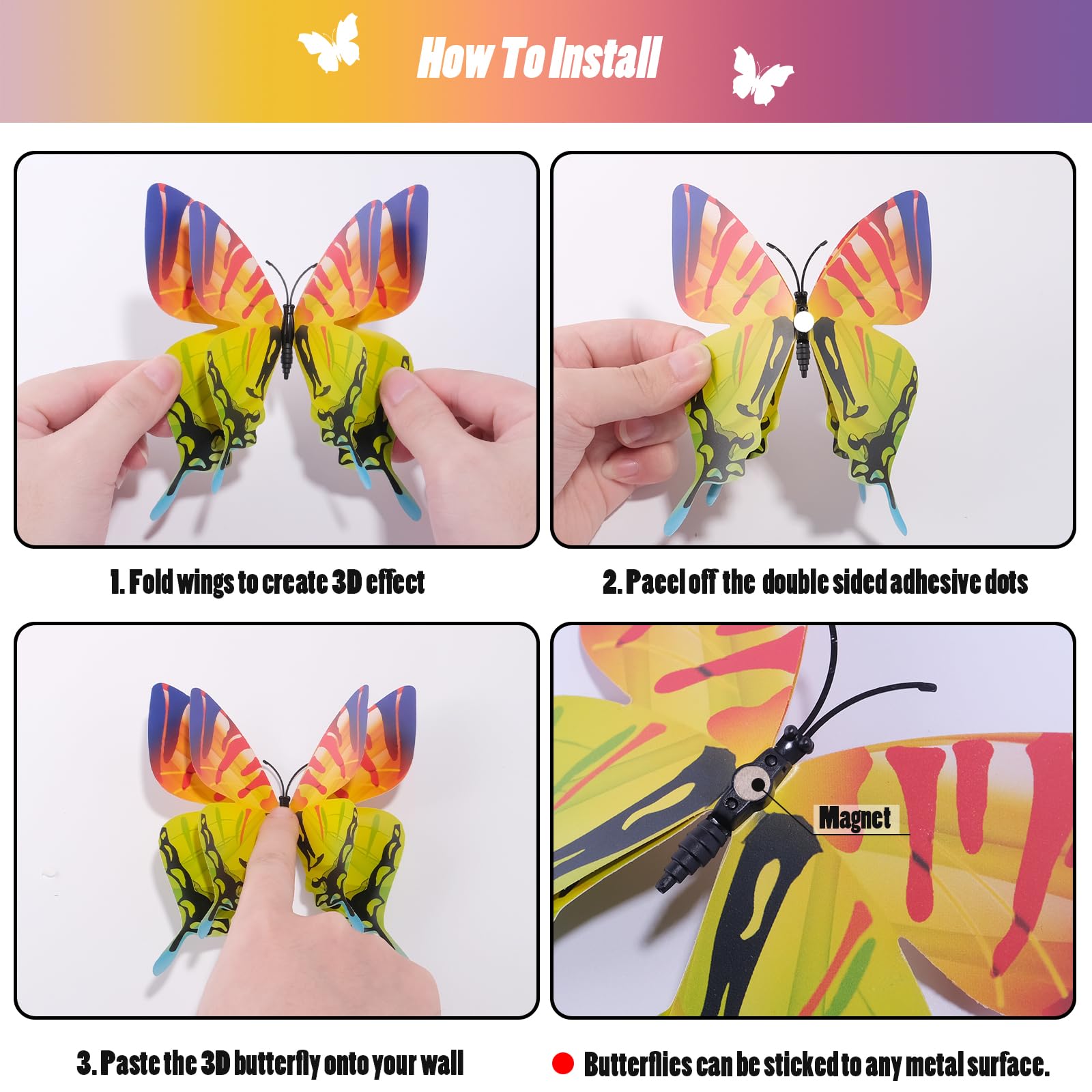 【Package Included】A set of 24 Pcs butterfly of 12 styles. 4 Pcs-4.7 inches, 4 Pcs-3.9 inches, 8 Pcs-3.1 inches , 8 Pcs-2.3 inches. Coming with 30 Pcs adhesive dots, extra glue points for replace.