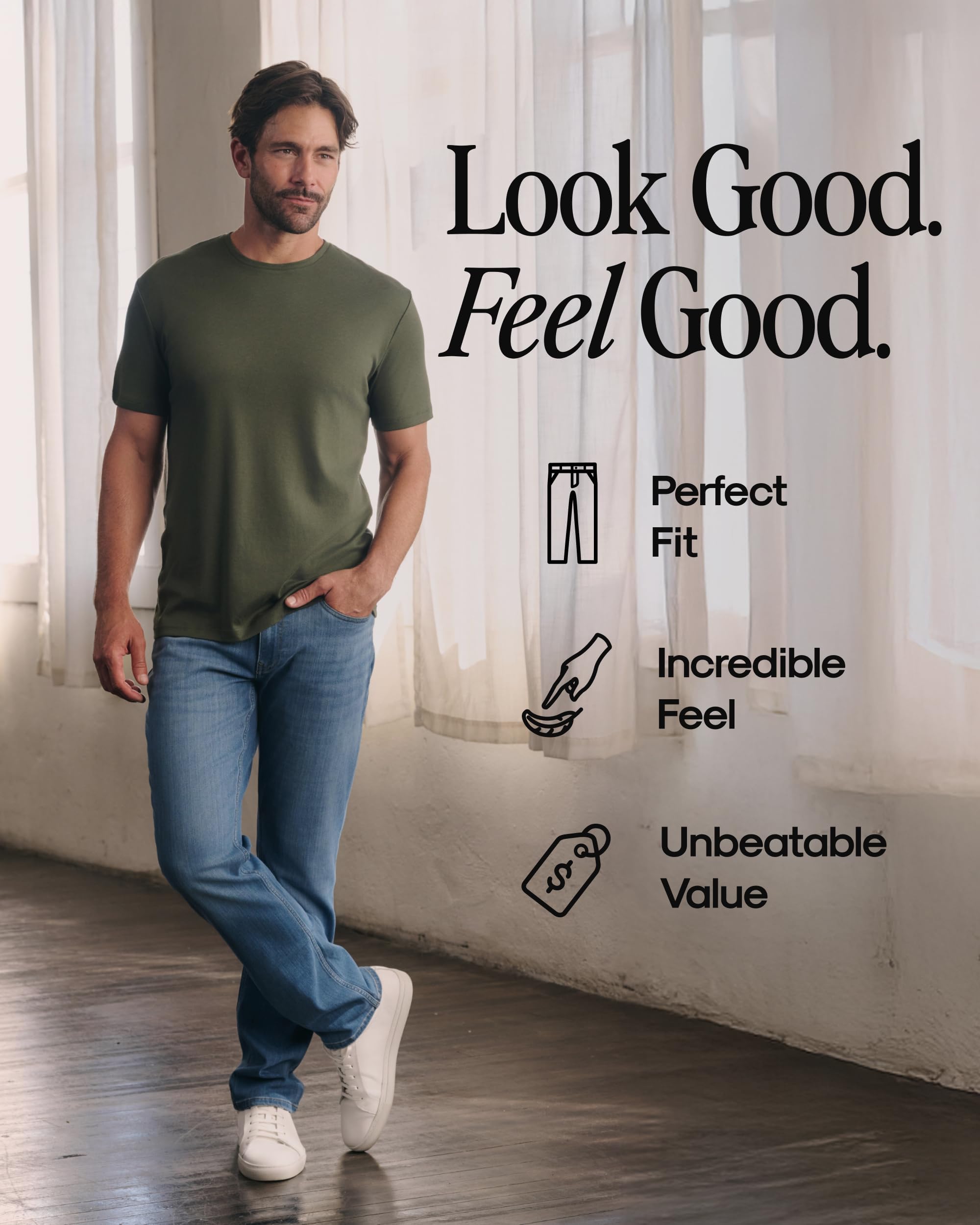PERFECT FIT EVERY TIME: Our mens jeans stretch when you need them, are tailored in the right places and have room where you need it. Choose slim men's jeans for a modern tapered look or the mens jeans with relaxed fit for a classic silhouette.