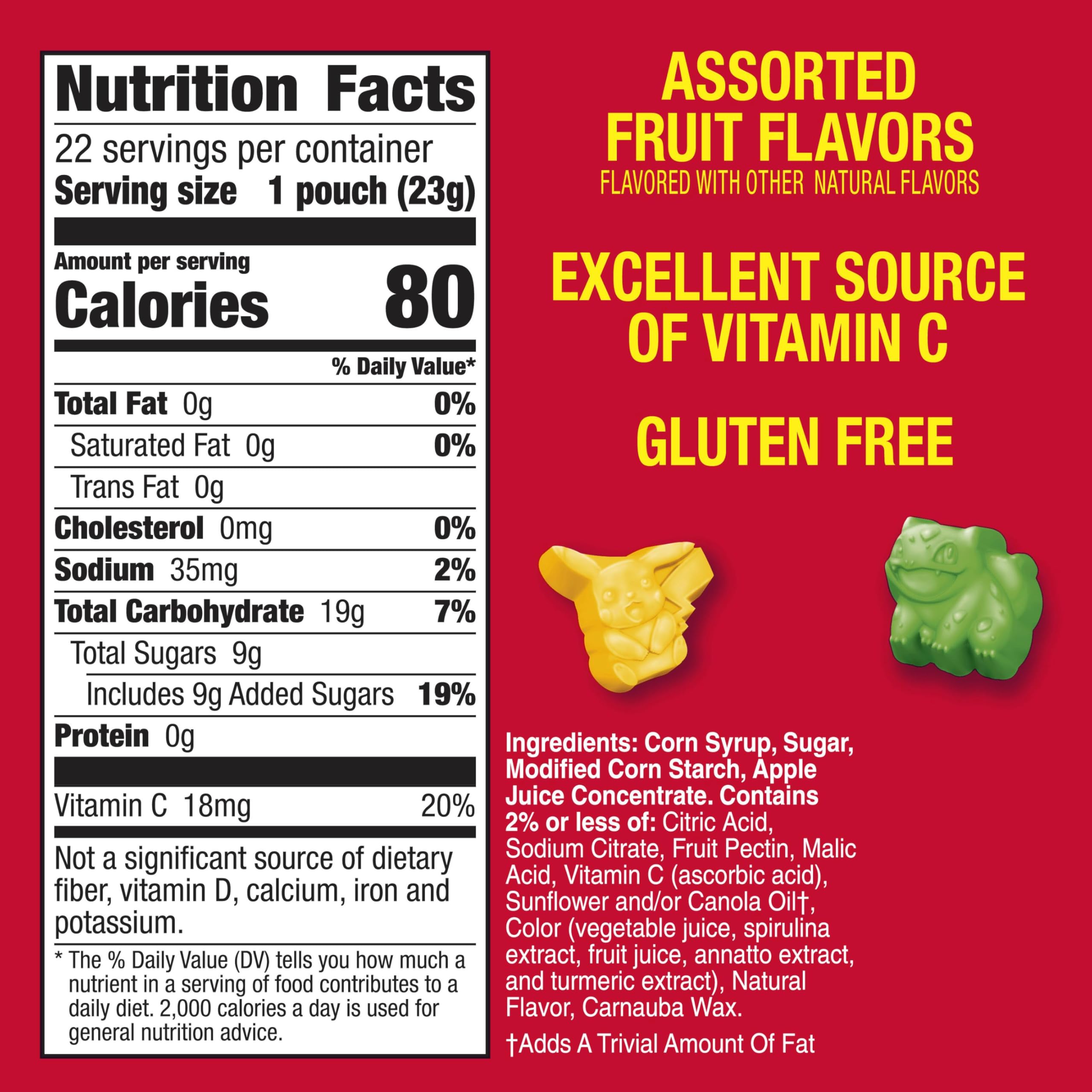 Pokemon Fruit Flavored Snacks feature tasty treats shaped like your favorite Pokemon characters for maximum fun. Made with no colors from artificial sources, these fruity snacks have an excellent source of vitamin C and 80 calories per serving. Pokemon gummy snacks are gluten free and fat free. Stock in the pantry for kids lunch boxes, on the go family adventures, and more. This 22 pouch value pack is great for after school snacks, after activity treats, or in Pokemon goodie bags for a kids birthday party. Whether you need quick, easy snacks for your busy family or travel snacks for plane rides or road trips, keep these fun, fruit flavored gummy snacks on hand for everyone to enjoy.