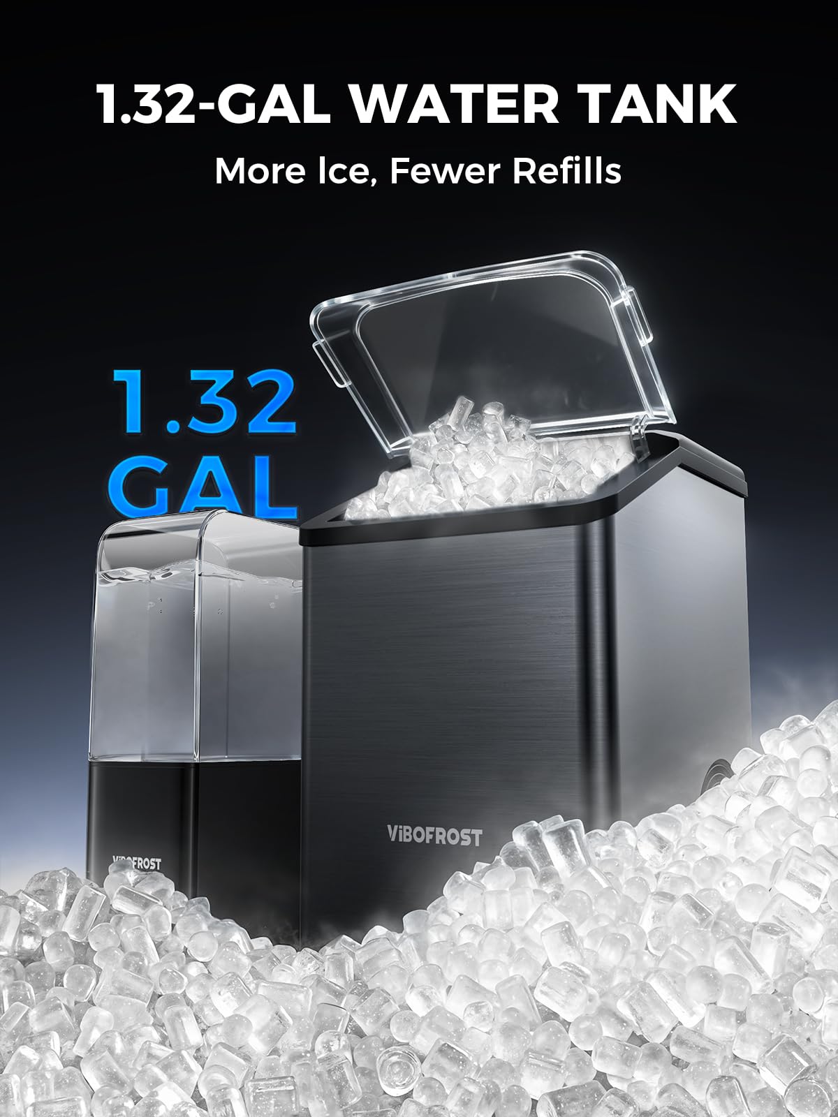 [Higher Ice Production]: With a 1.32-gallon removable tank, this ice maker churns out nearly 4× the ice per batch, reducing refills for hassle-free chilling