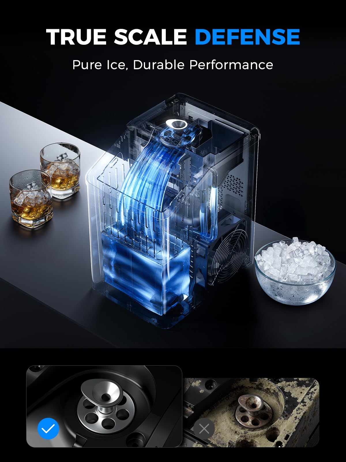 [Smart Control Panel]: One-touch ice making and cleaning for effortless use. Intuitive LED indicators show water levels and ice status, making the whole process simple and smart