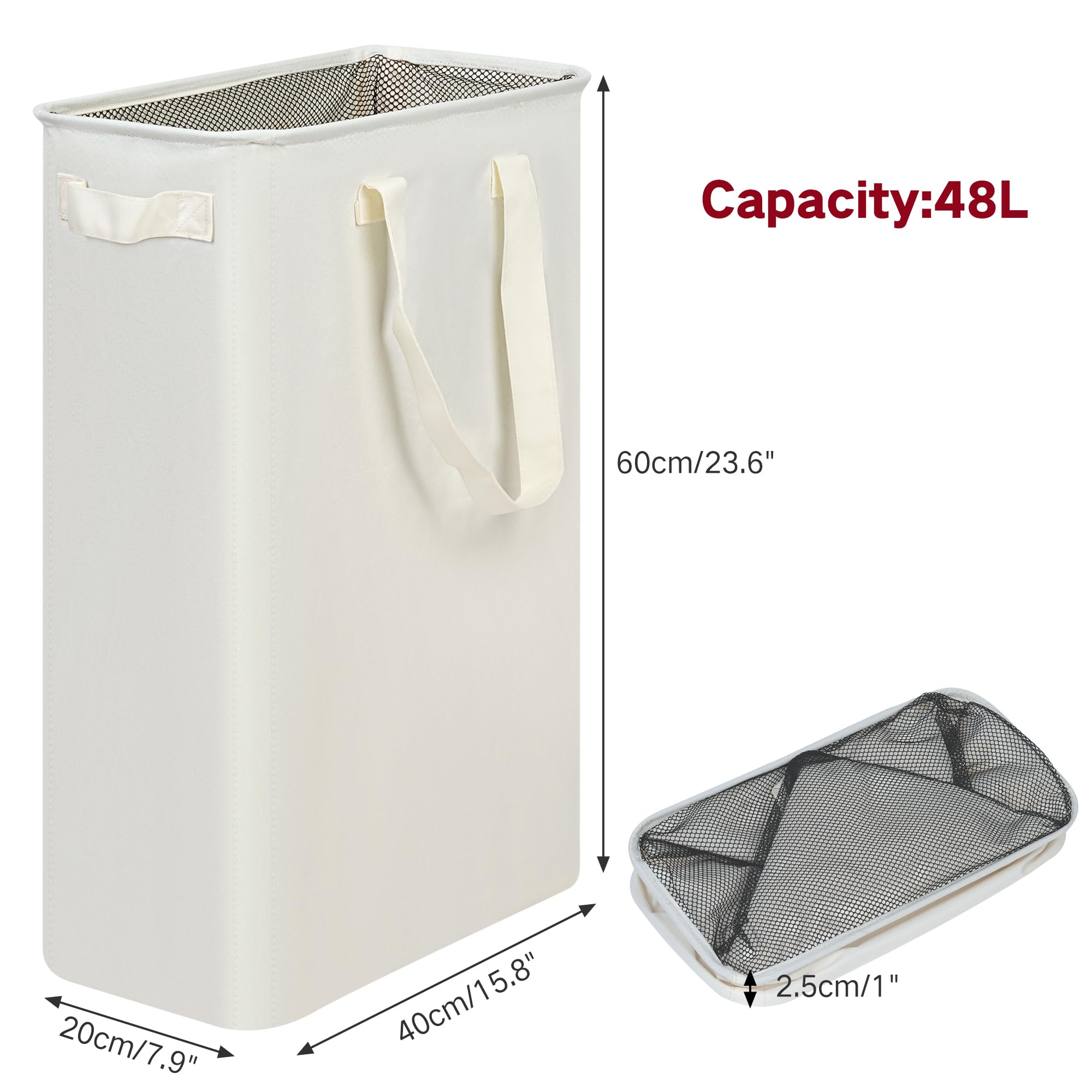 Dimensions: efluky skinny laundry basket measures 15.8''L x 7.9''W x 23.6''H. The capacity is 48L, which is very suitable for storing one person's dirty clothes.