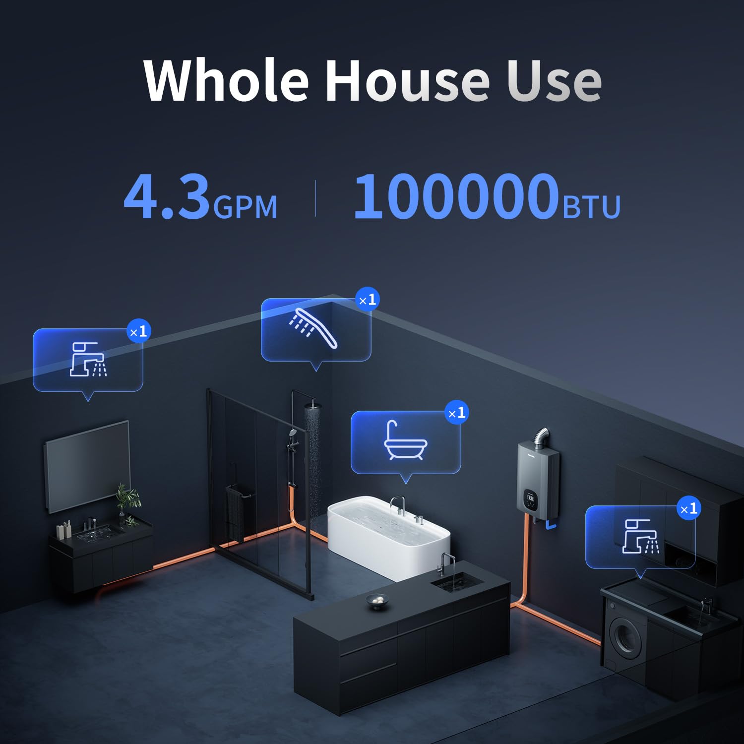Performance: The on-demand tankless water heater boasts a heating capacity of 100,000 BTU and a hot water flow rate of 4.3 gallons per minute (GPM). It can provide continuous hot water for 2-3 water supply points, making it sufficient to meet the hot water needs of a household's bathroom, kitchen, and bar area.
