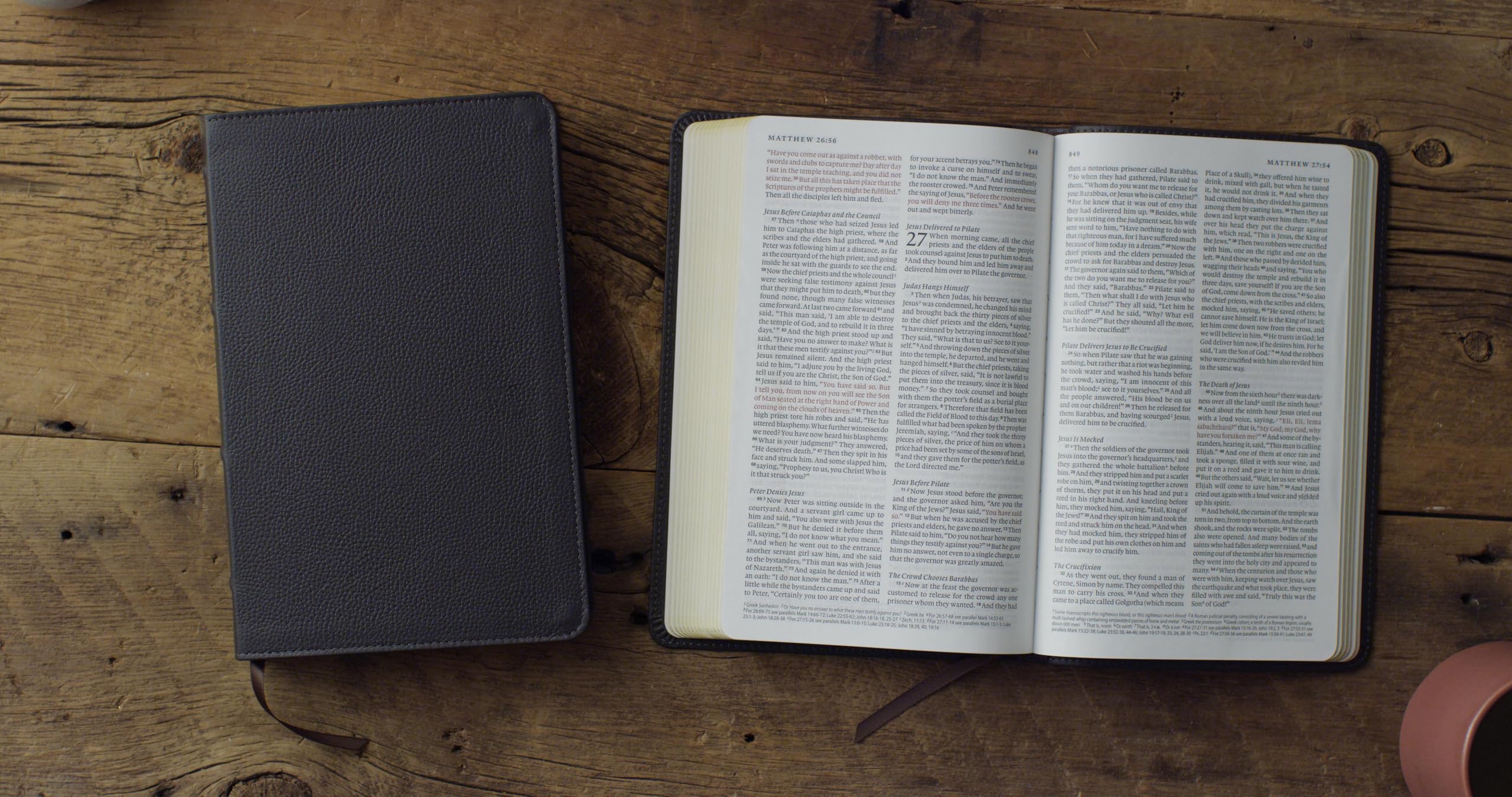 Full ESV Bible in a Portable Size This edition of the top-selling ESV Thinline Bible features the words of Christ in red, a ribbon marker, and gilding. At one inch thick, this classic edition is ideal for use at home and on the go. 1" Thick: Portable size for easier carrying Quality Production: Features a buffalo-leather cover, gilding, a ribbon marker, and a lifetime guarantee Red Letter: Words of Christ in red Additional Content: Concordance and maps
