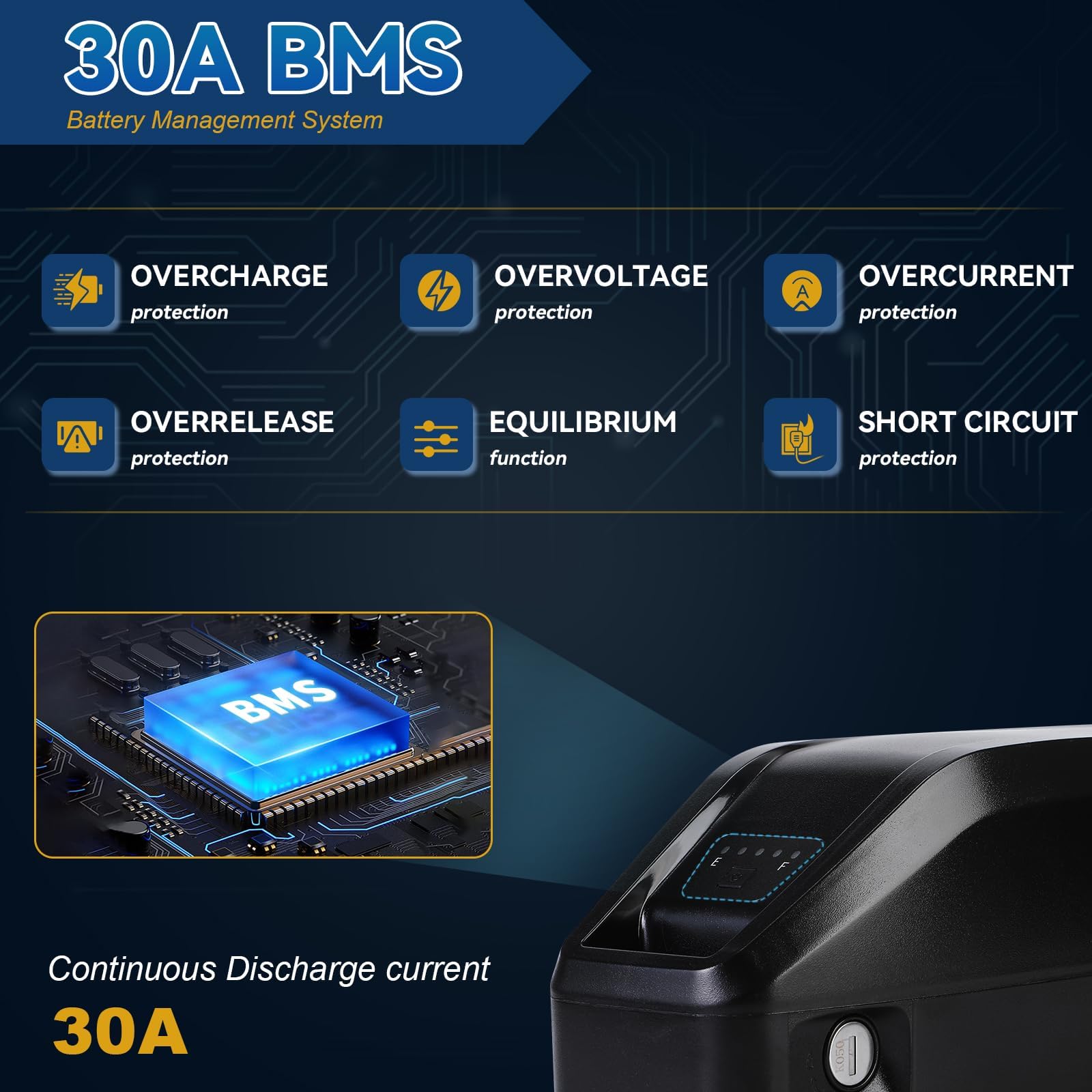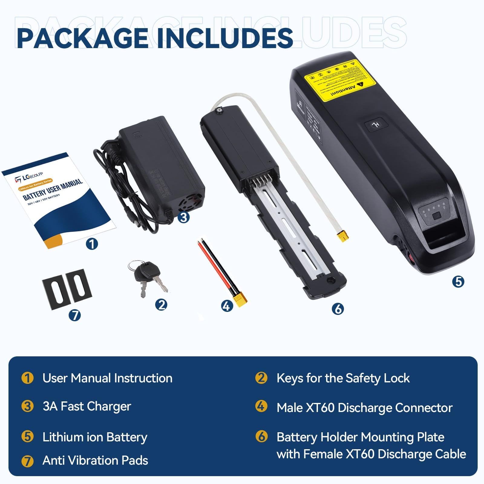 【Pack Includes】1 x 48V 15AH Battery,1 x 3A Fast Ch-arger,2 x Keys for the Safety Lock,1 x 5Pin Battery Holder Mounting Plate with Female XT60 Discharge Cable,1 x Male XT60 Discharge Connector,2 x Anti Vibration Pads,1 x User Manual.We are committed to providing high-quality products and good shopping experience!30A BMS-Battery Management System,which can effectively protect the battery and make it safer.