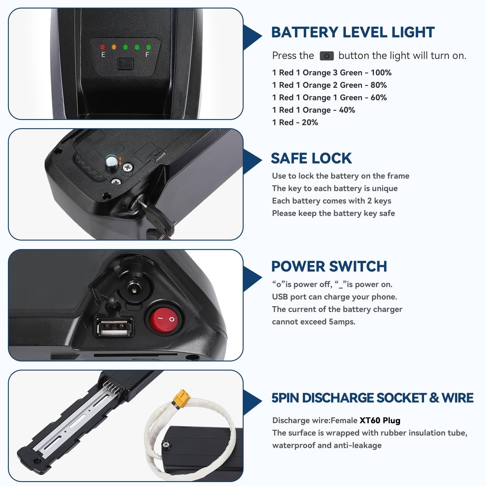 【Design Features】 ▶ Safe Lock:Anti-theft function.▶ LED power Indicator:Real-time battery level detection,reminds you to charge the battery.▶ Power Switch:Reduces battery power loss.▶ USB Port:can charge your phone.▶30A BMS:can effectively protect the battery and make it safer.▶ Waterproof case:Reduces the possibility of damaging the internal battery.▶Anti vibration Pads:Protect the battery and reduce battery damage.▶5Pin Discharge Base:Product with battery base, easy to install.▶ Discharge wire with yellow wax tube, which is waterproof, anti-electricity and high temperature resistant!