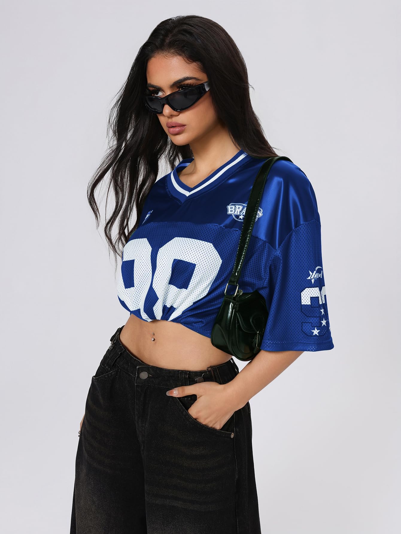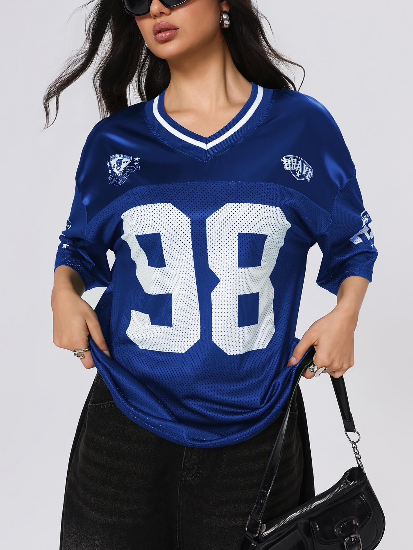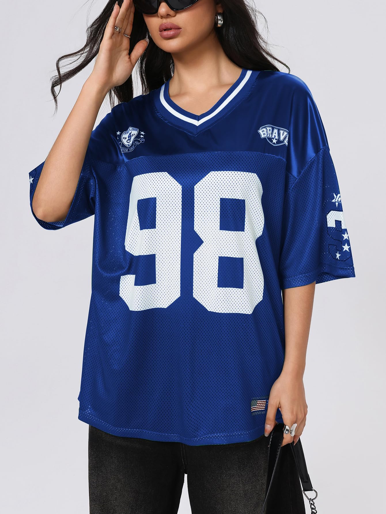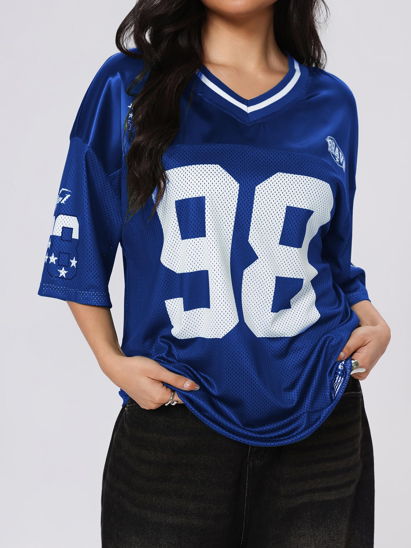 Features: trendy y2k jersey shirts, cute football jerseys, y2k graphic tee, oversized tee tops for women, going out tops for women, vintage t shirts, letter print, striped, mesh, v neck, half sleeve, drop shoulder, loose fit, fashionable