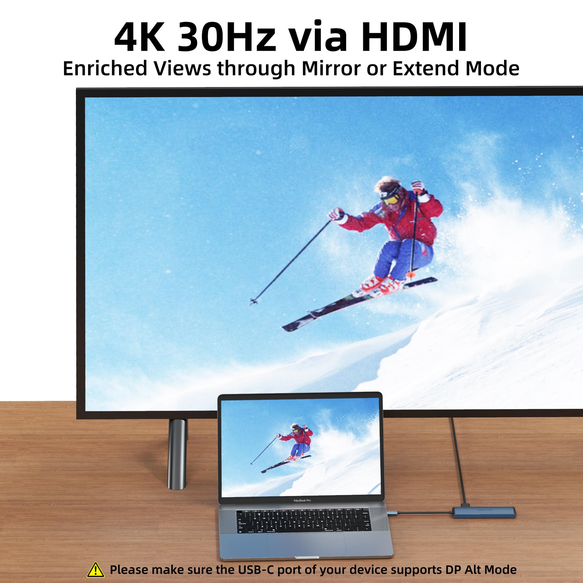 [4K 30HZ HDMI] The HDMI (female) port on this USB-C Hub Multiport Adapter supports high-resolution HDMI video output of up to 4K at 30Hz. Connect your USB-C enabled device to an ultra HD display, projector, or TV via extended or mirror mode, and enjoy stunning clarity and sound.