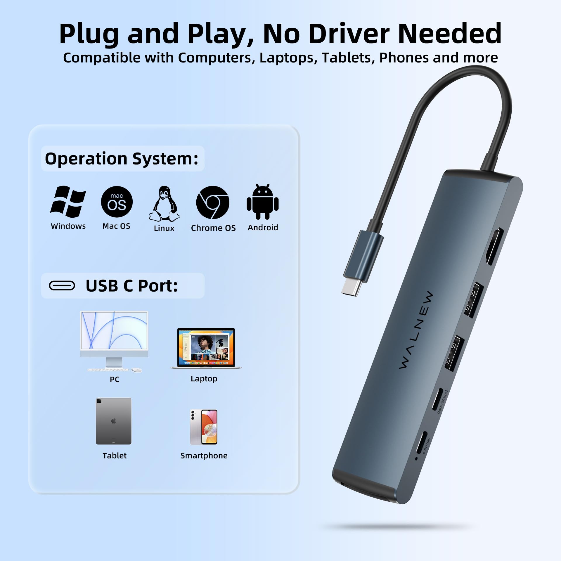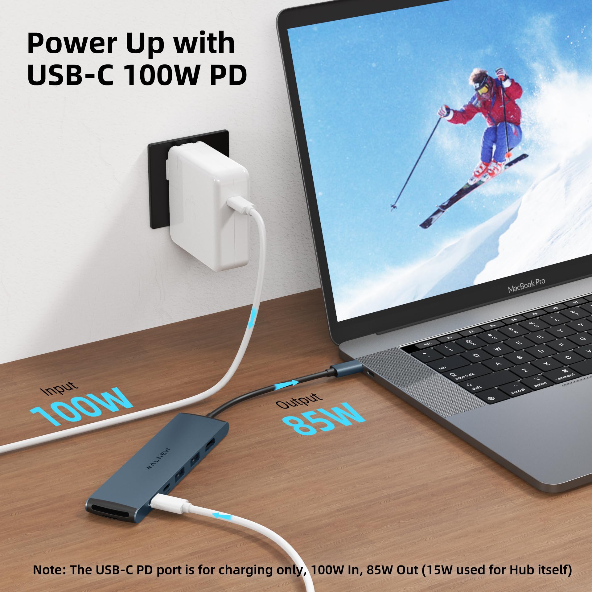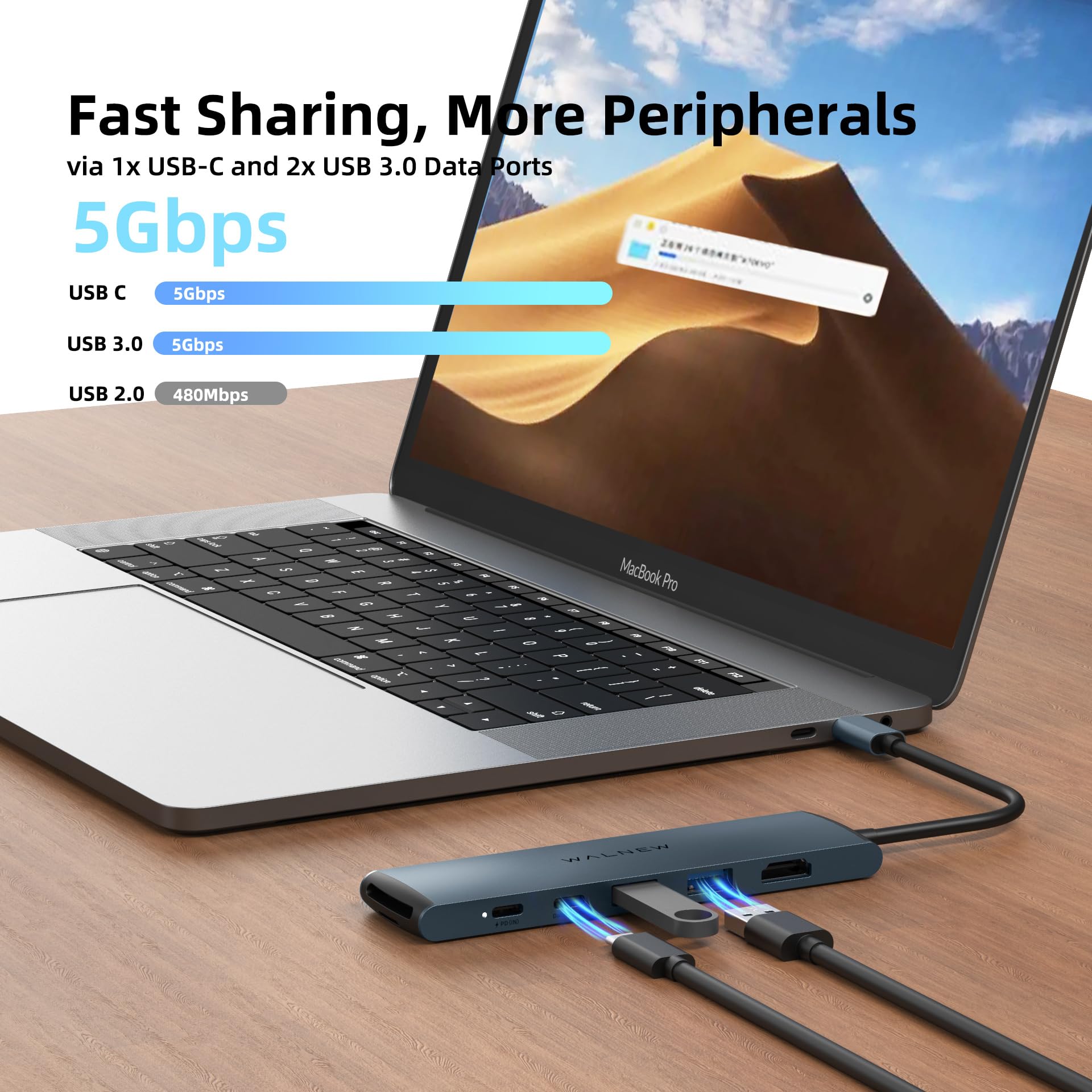 [7-in-1 USB-C Hub] The USB-C Hub features a 4K 30Hz HDMI, 100W USB-C Power Delivery (PD) input, three 5Gbps data ports (1 USB-C, 2 USB 3.0), and SD/MicroSD card slots. Its 7-in-1 design and 100 watt fast charging ensure your device maintain ample power while expanding various peripherals, boosting work efficiency.