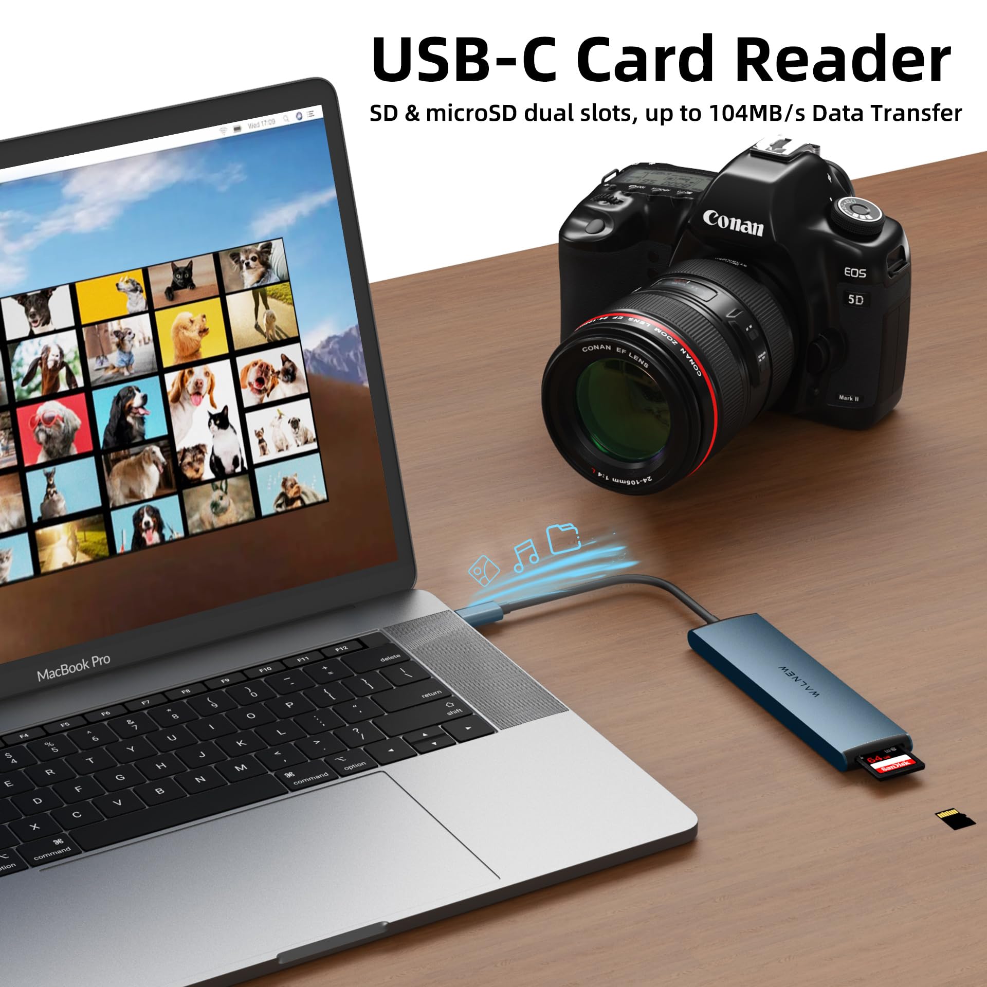 [SD/TF Card Reader] This USBC HUB's dual card slots make it easy to transfer photos, music, and videos at up to 104MB/s to USB-C enabled laptops, tablets, and phones. It works with UHS-I memory cards like SD, SDHC, SDXC, MicroSD, MicroSDHC, and MicroSDXC, making it versatile for all your data read/write needs.