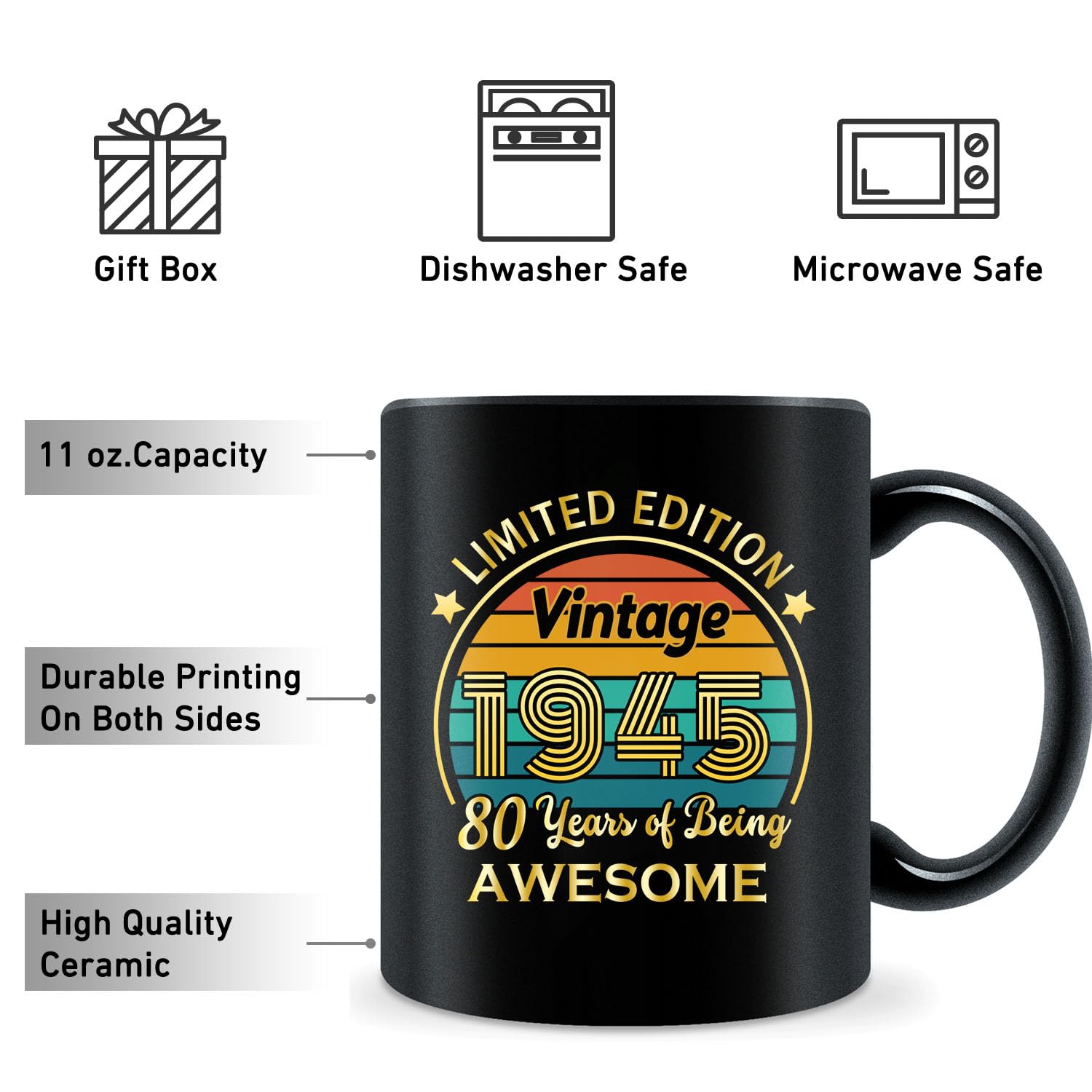 Nostalgic Design: Featuring a stylish and timeless design, this mug highlights the significance of the year 1945. Ideal for those who appreciate a touch of nostalgia, it's a unique and thoughtful gift that stands out from the ordinary.