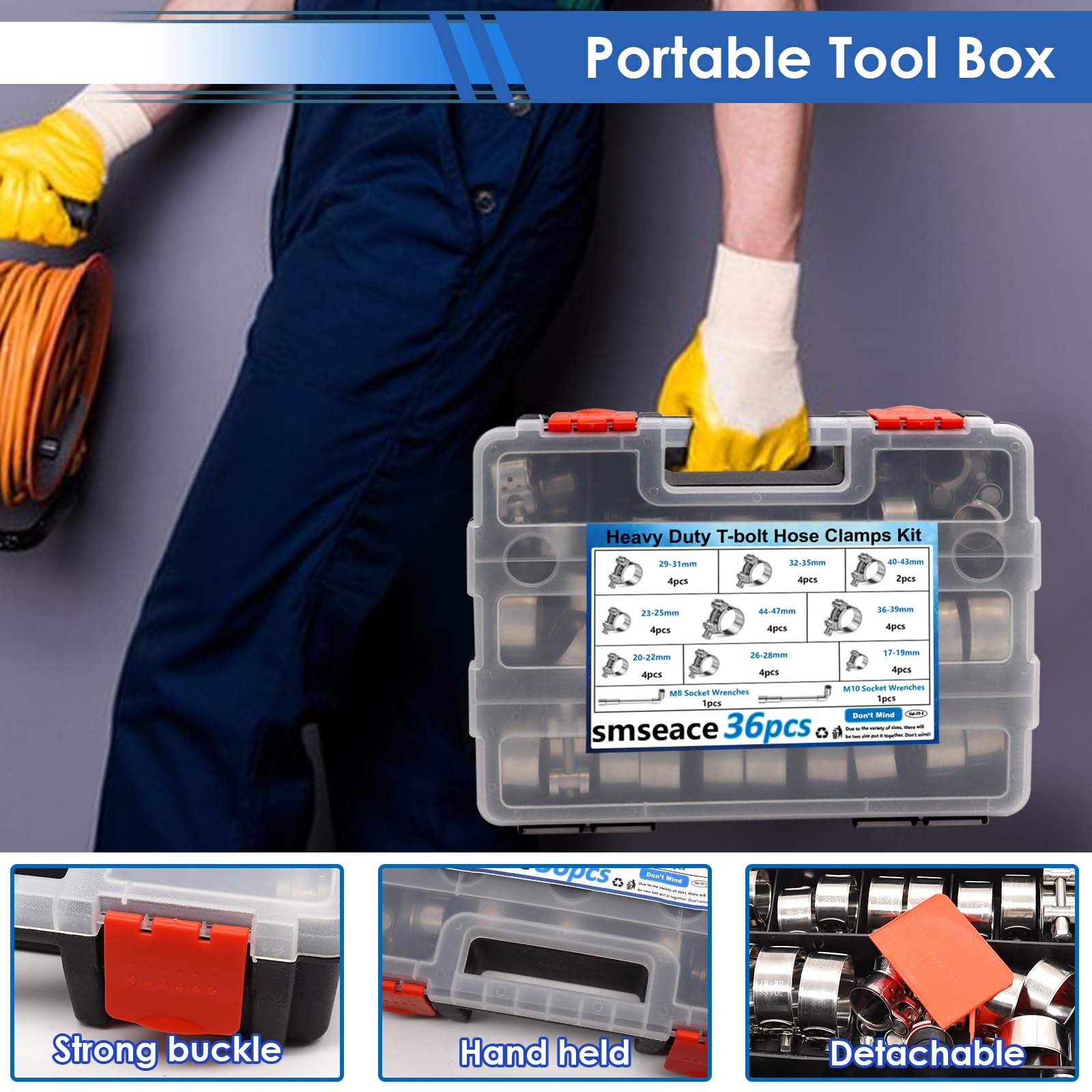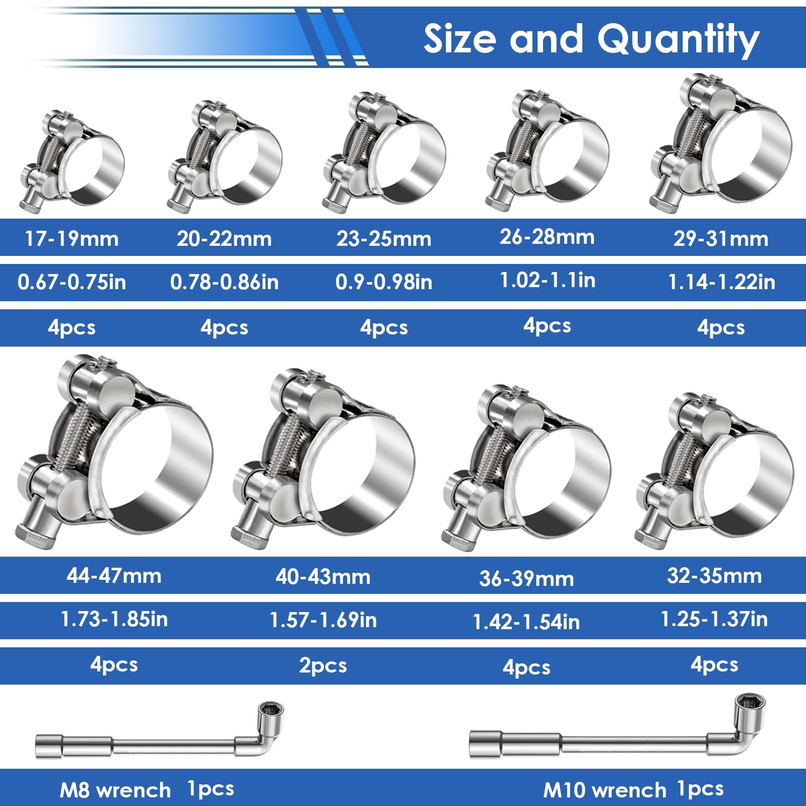 You Get: Hose clamps assortment kit have 34pcs different specifications,including 17-19mm(4pcs), 20-22mm(4pcs),23-25mm(4pcs),26-28mm(4pcs),29-31mm(4pcs),32-35mm(4pcs),36-39mm(4pcs),40-43mm(2pcs),44-47mm(4pcs)