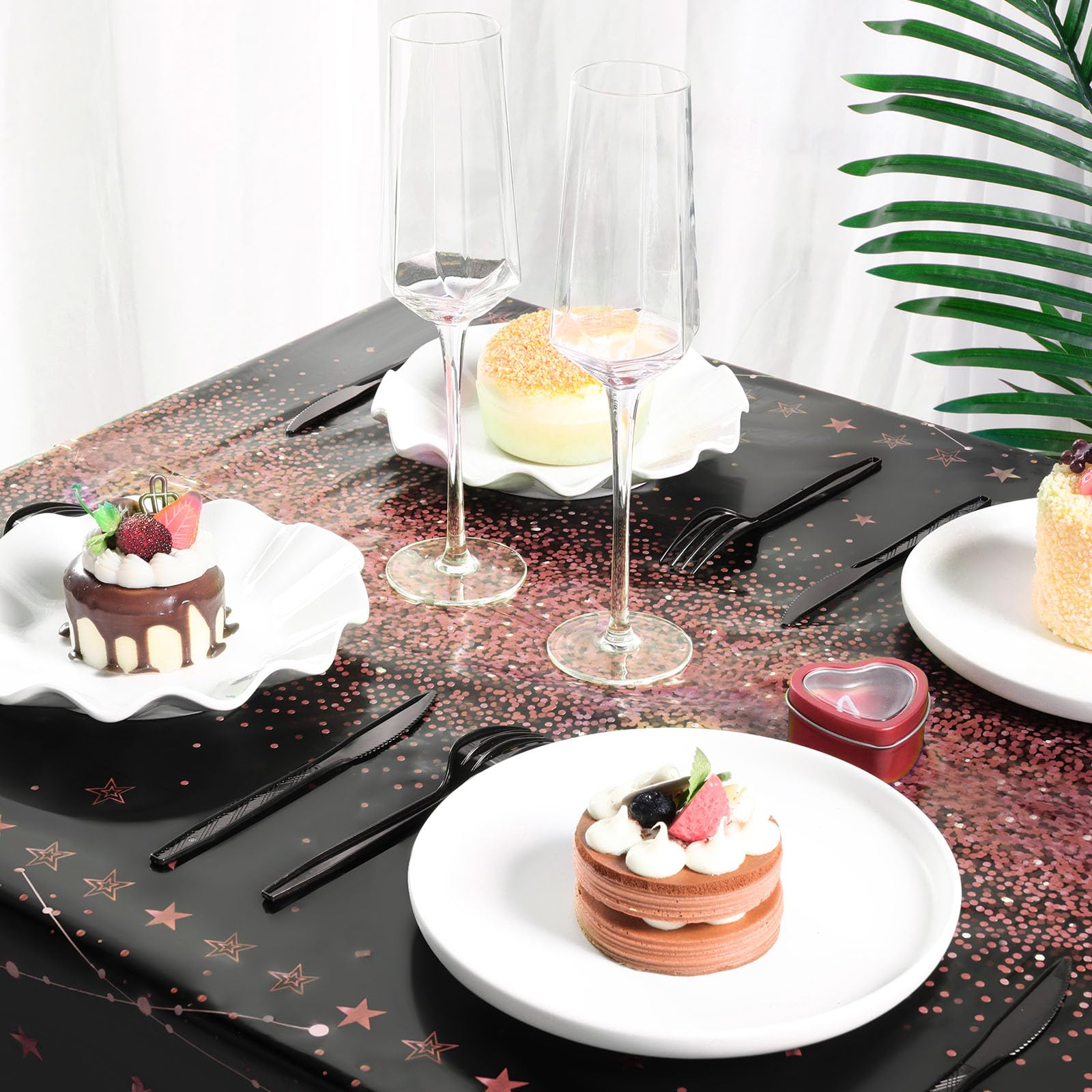 Size Information: our black and rose gold disposable tablecloth measures about 54 x 108 inches/ 137 x 274 cm, large enough to cover most rectangular tables, and can also serve as mats for picnics