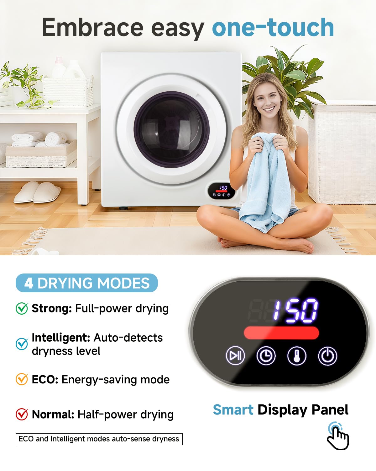 【Easy to Operate】Designed with user-friendly LED touch control, this electric dryer is simple to operate. It offers four drying modes to suit different fabrics and load weights, and once you set it, you can go about your day while it works. The mini dryer runs quietly, so you won’t be disturbed during conversations or while sleeping.