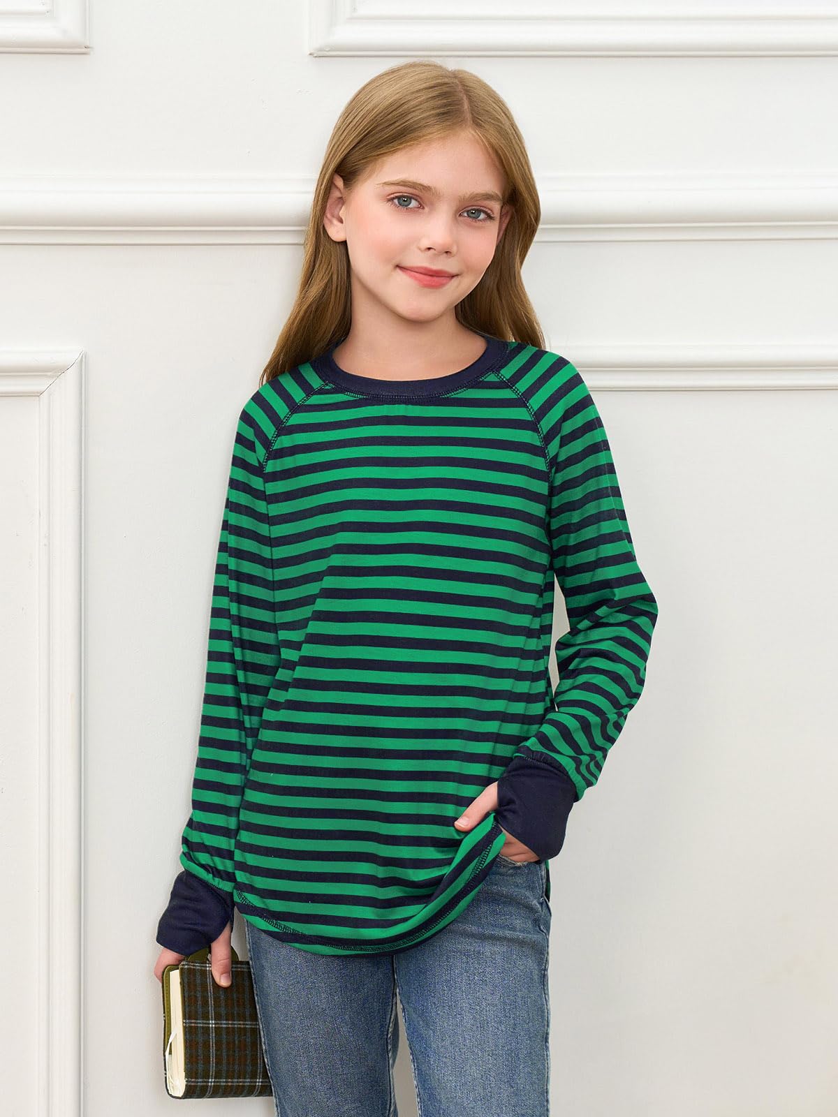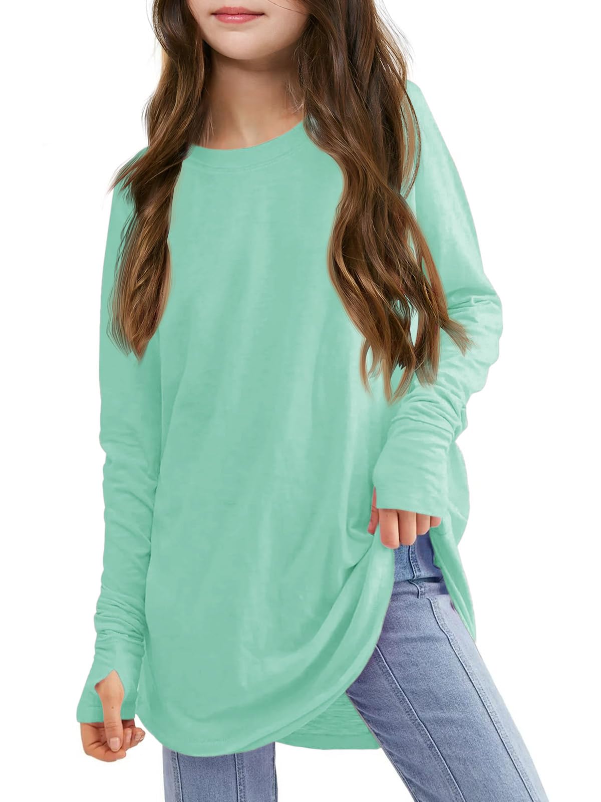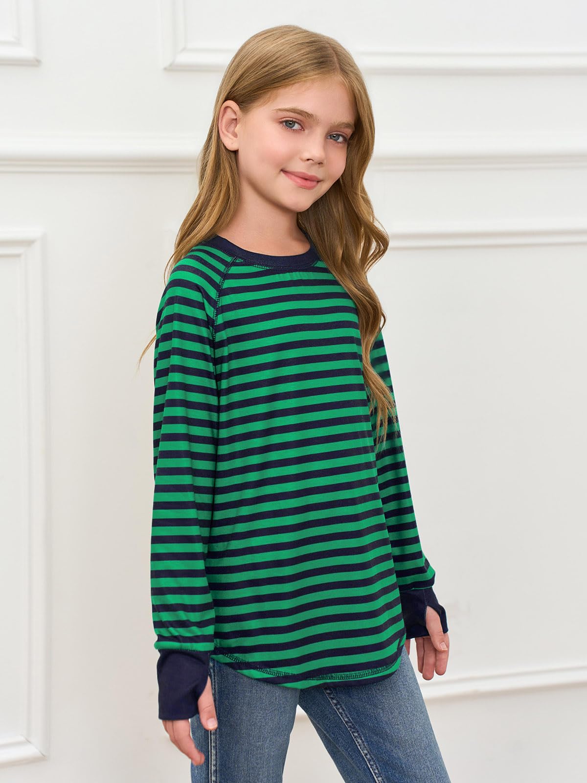 Features: Long sleeve shirts for girls loose fit, casual pullover tunic round neck tops with thumb holes, casual t-shirt, crew neck sweatshirt for kids, cute fall tops with curved hem, classic stripe colors top. The curved hem will bring some much needed “oomph” to your day-to-day looks
