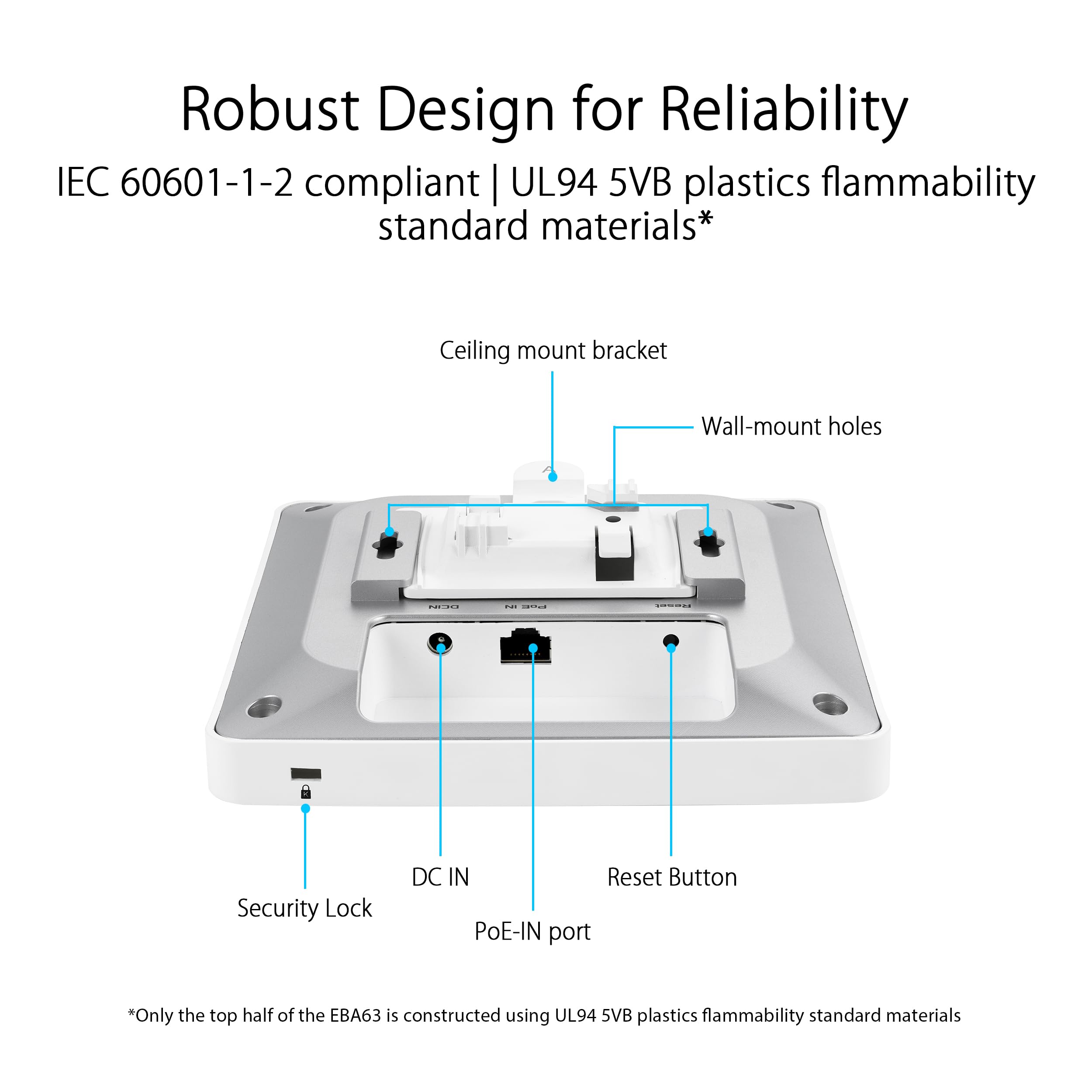Built for Safety and Reliability — Compliant with IEC 60601-1-2 standards, and with the top half of the device made of materials that meet the UL94 5VB plastics flammability standard*, the EBA63 ensures a stable and reliable connection.*Only the top half of the EBA63 is constructed using UL94 5VB plastics flammability standard material.