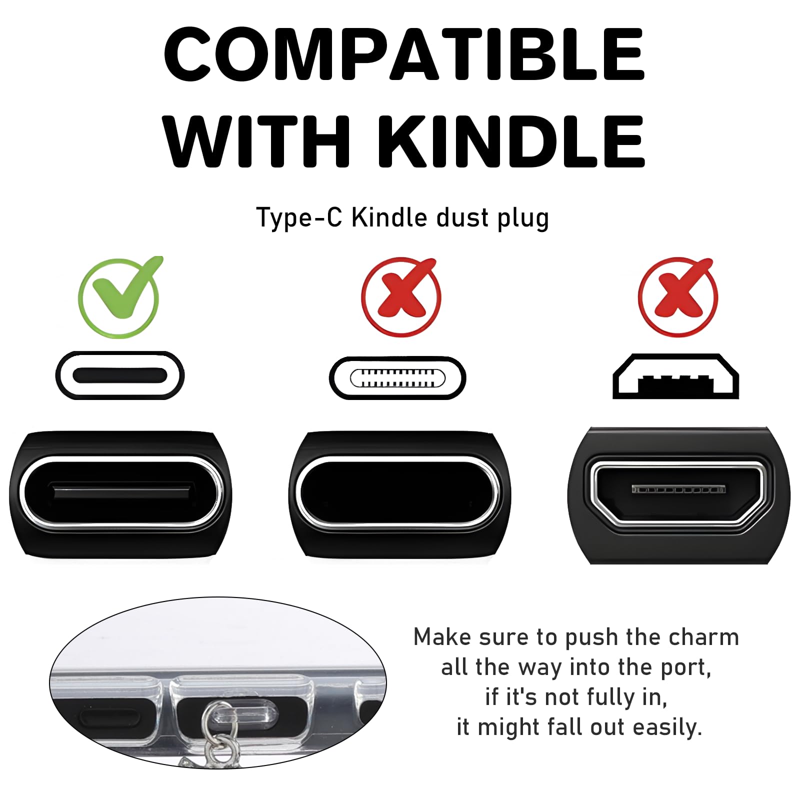 Universal Compatibility: These dust plugs and charm chains are designed to fit Kindle models(most), E-Readers, and smartphones with a Type-C charging port. Easy to use, simply plug in to keep dust out and add a stylish flair