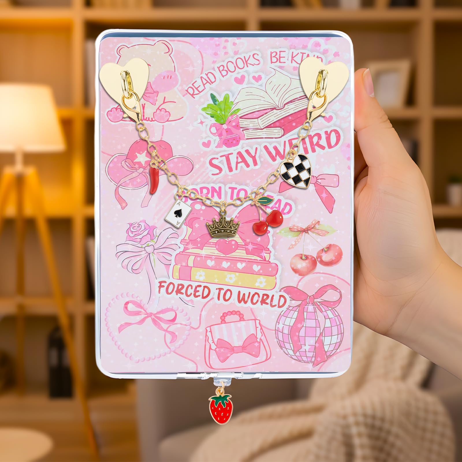 Stylish & Unique Design: Includes 4pcs strawberry crown golden chain with dust plugs for Kindle, and phone, perfect for adding a celestial and cute touch to your device. Ideal for book lovers, readers, and those who love unique accessories