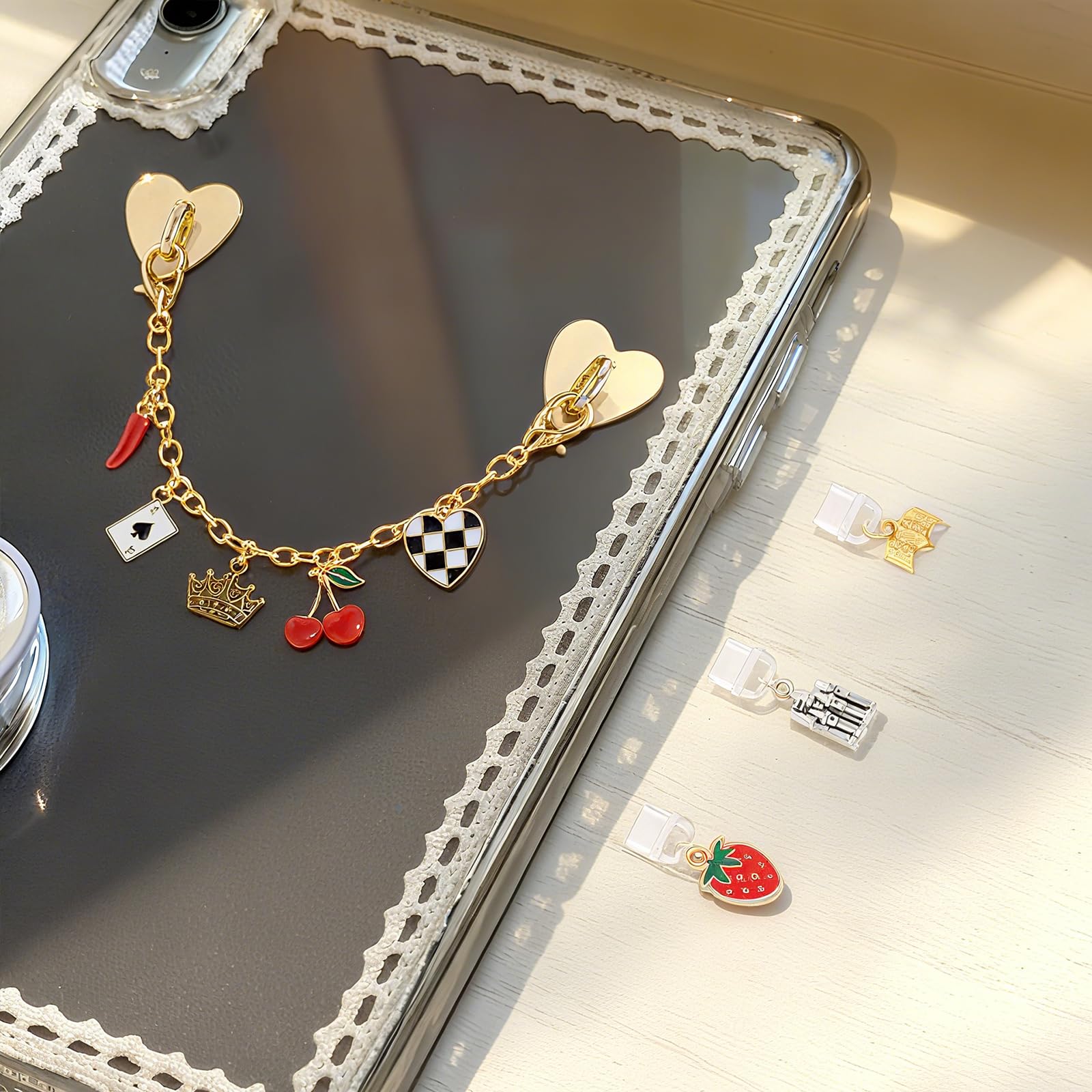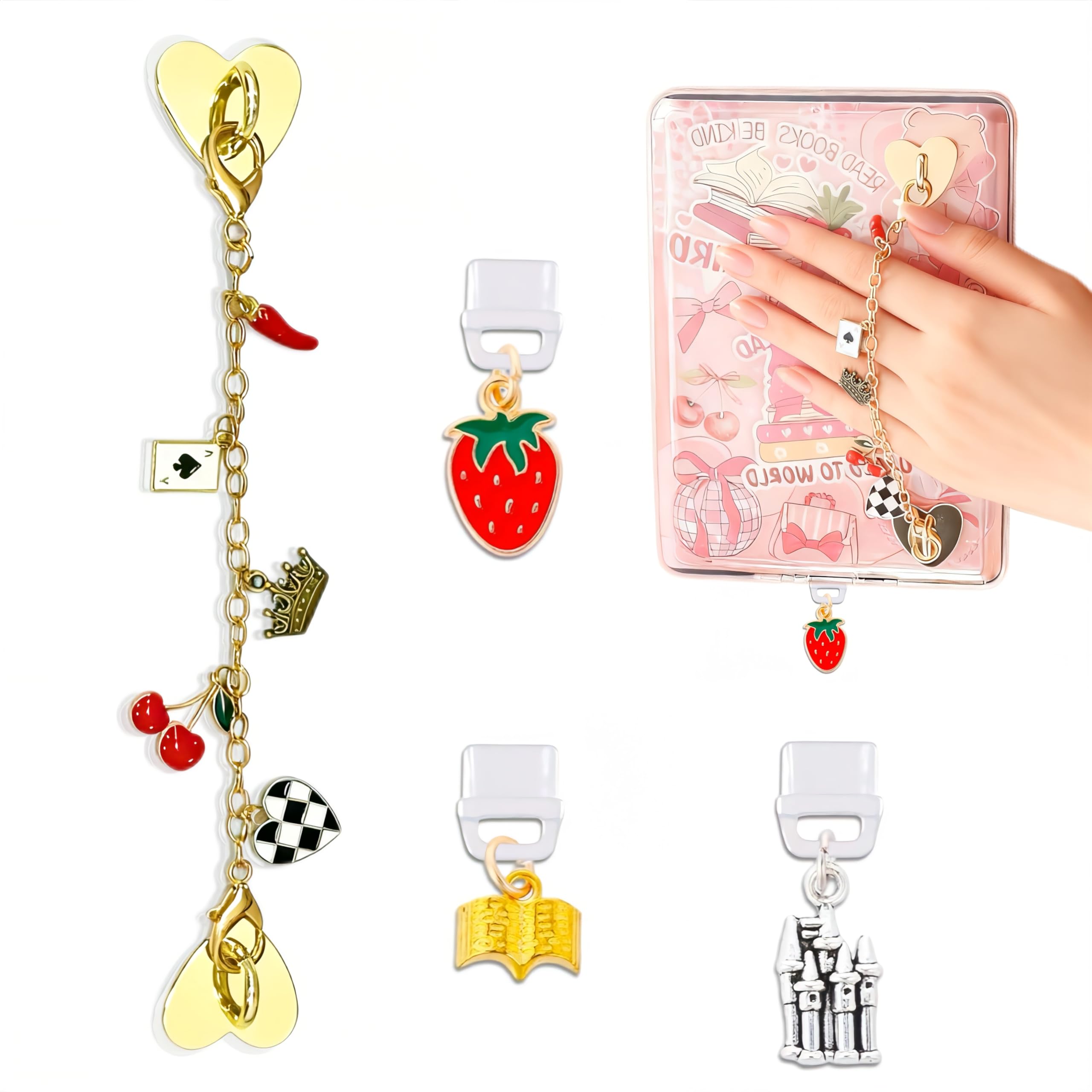 Complete Accessory Set: Includes 4 pieces—3 Elegant and lovely Type-C dust plugs and 1 gold charm chain designed to decorate for Kindle, e-reader, or smartphone with a personalized, fashionable flair