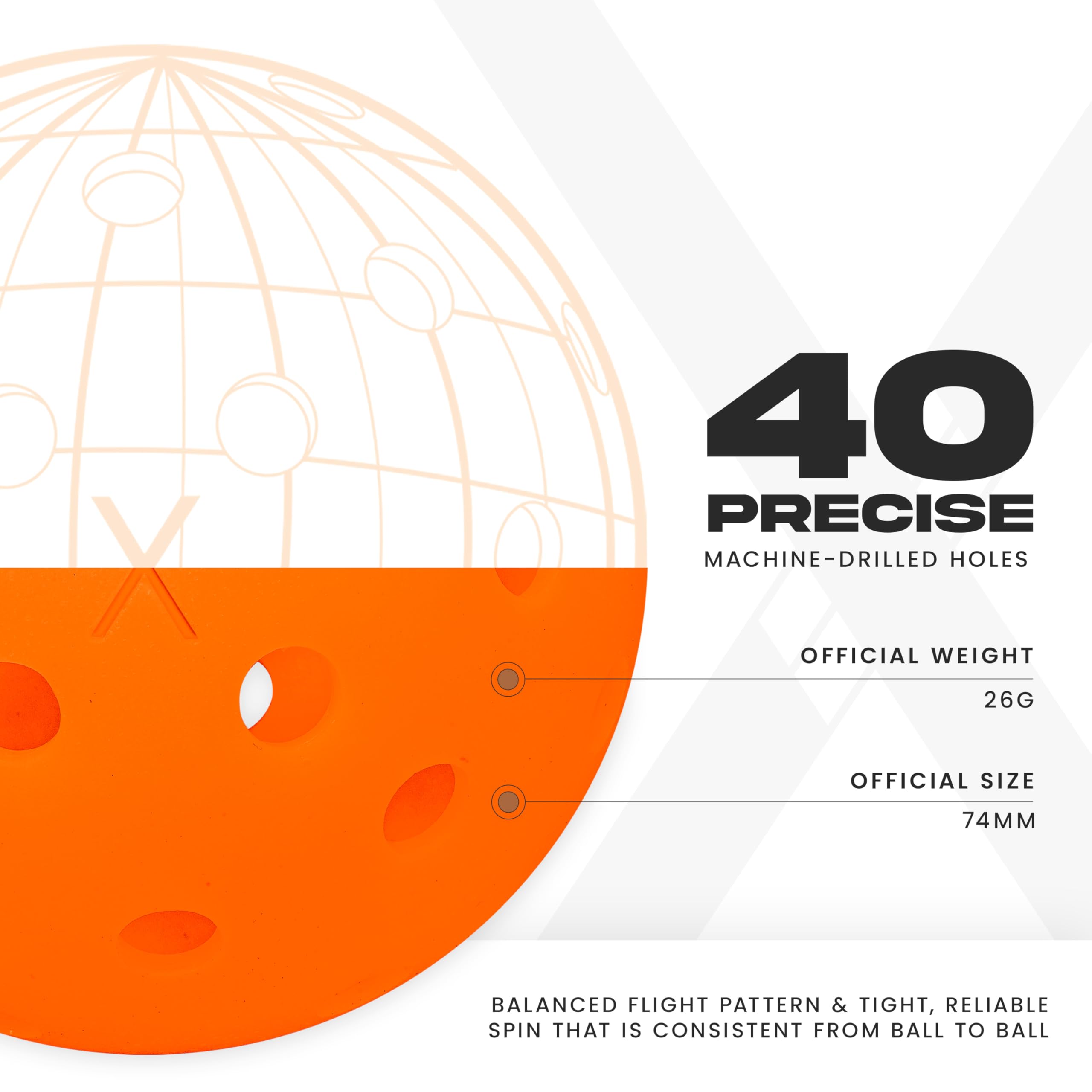 PRECISION DESIGN: X-40 pickleballs are constructed with 40 precise, machine-drilled holes for a balanced flight pattern and tight, reliable spin that is consistent from ball to ball