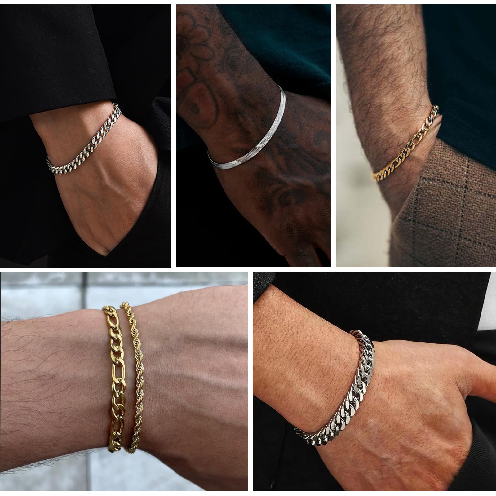 Size: The rope chain width: 5mm, paperclip chain width: 7mm, figaro chain width: 7mm, herringbone chain width: 6mm, cuban chain width: 8mm and 10mm. The bracelets length 7.5/8.3/9 inches, special size with 6.5/7 inches. Not only fit men wrist size but also women.