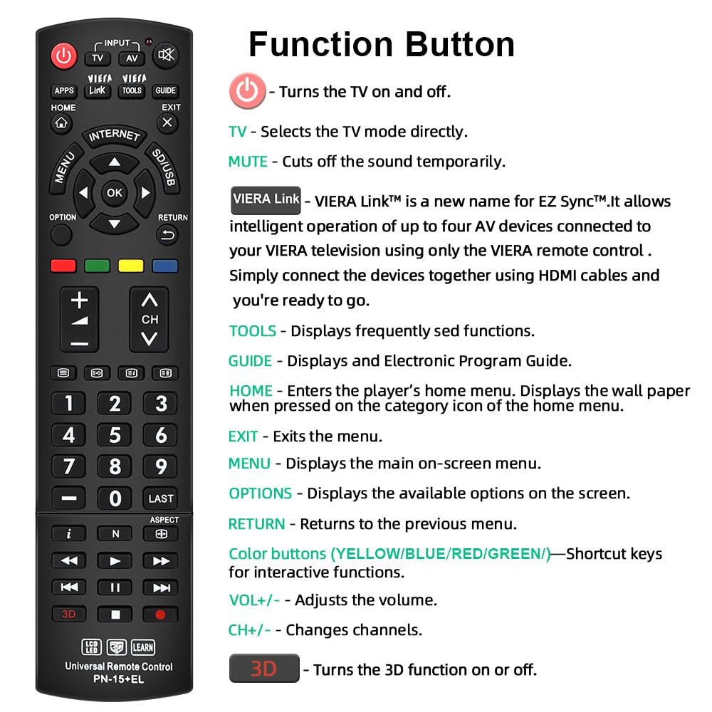 Gvirtue universal remote control compatible replacement for Panasonic TV/ VIERA Link/ HDTV/ 3D/ LCD/ LED. Applicable various Panasonic brand TV models: TC46PGT24 TCP42G25 TCP46G25 TCP50G20 TCP50G25 and more!