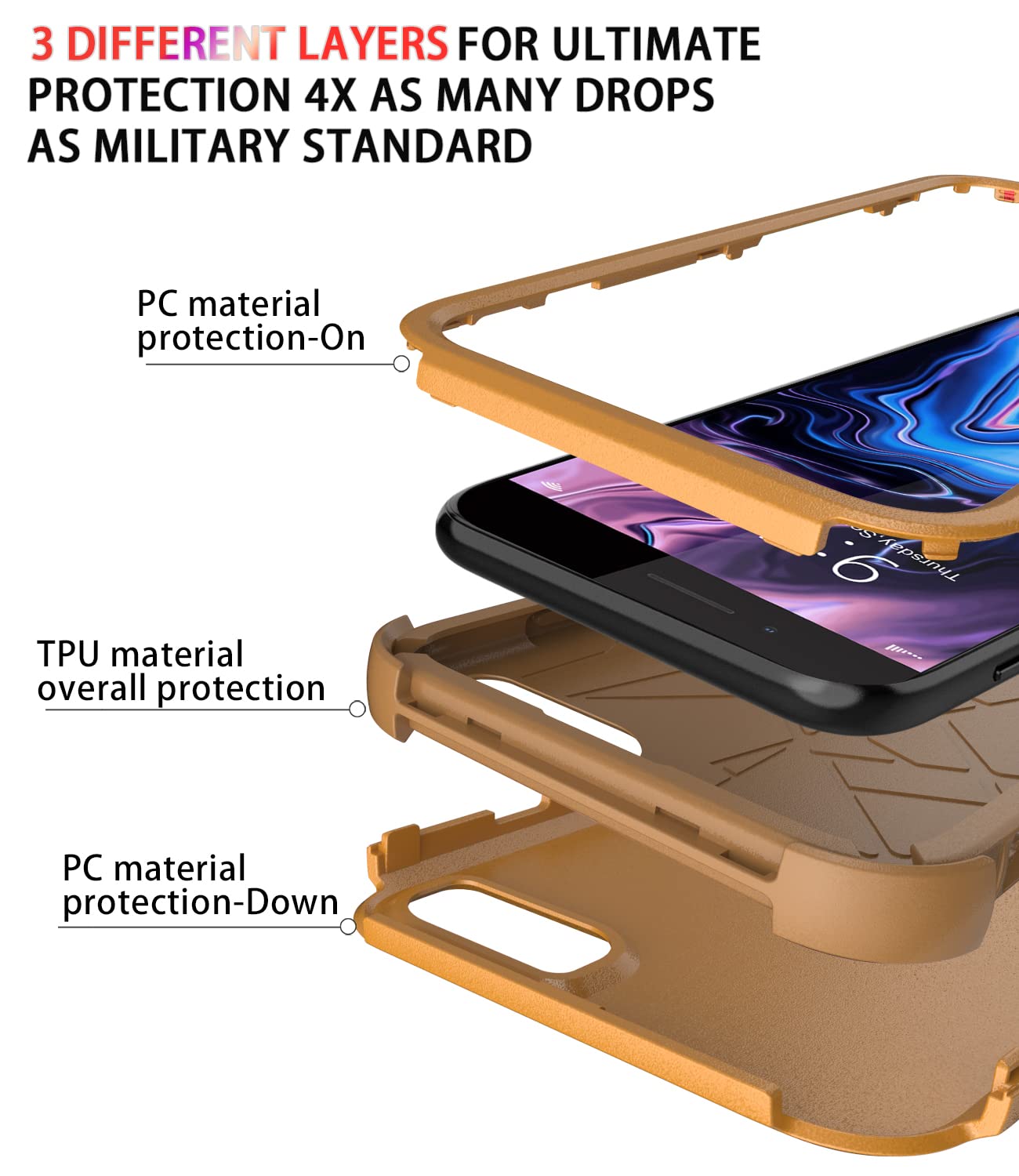 Multi-layer defense: Soft inner and hard outer layers absorb and deflect impacts, Three-in-one combination of military grade heavy armor open access to ports and speakers