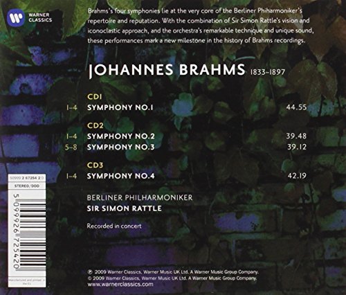 Sir Simon Rattle and the Berliner Philharmoniker have recorded the complete symphonies of Johannes Brahms live in a series of concerts from the Philharmonie, Berlin. This is a major recording of music that is central to the tradition of the 127-year-old orchestra, and is bound to be as groundbreaking and revelatory as Rattle's earlier recording of the complete Beethoven symphonies with the Vienna Philharmonic. The combination of the incomparable sound and musicianship of the Berliner Philharmoniker and the iconoclastic, visionary approach that has characterized Sir Simon's music-making over the past thirty years is likely to result in a set of recordings that will challenge, invigorate, and refresh this well-known and cherished repertoire. Rattle's first Brahms recording with the Berliner Philharmoniker, Ein deutsches Requiem, won critical accolades and both Grammy® and Classic FM/Gramophone Awards. Now Sir Simon and the Orchestra have committed to disc the complete Brahms symphonies, recorded in concert at Berlin's Philharmonie in Autumn of 2008. In the words of Die Zeit, "Simon Rattle has finally dared to tackle Brahms with the Berliner Philharmoniker. He combines Furtwängler's monumentality with Karajan's beautiful sound . . .". Rattle confirms that performing these works with the Berliner Philharmoniker, which has been hailed as the world's greatest Brahmsian, orchestra "gives you a possibility of colours that you have almost nowhere else. . . . I can say to this orchestra, `I need a different sound' and the sound changes immediately."