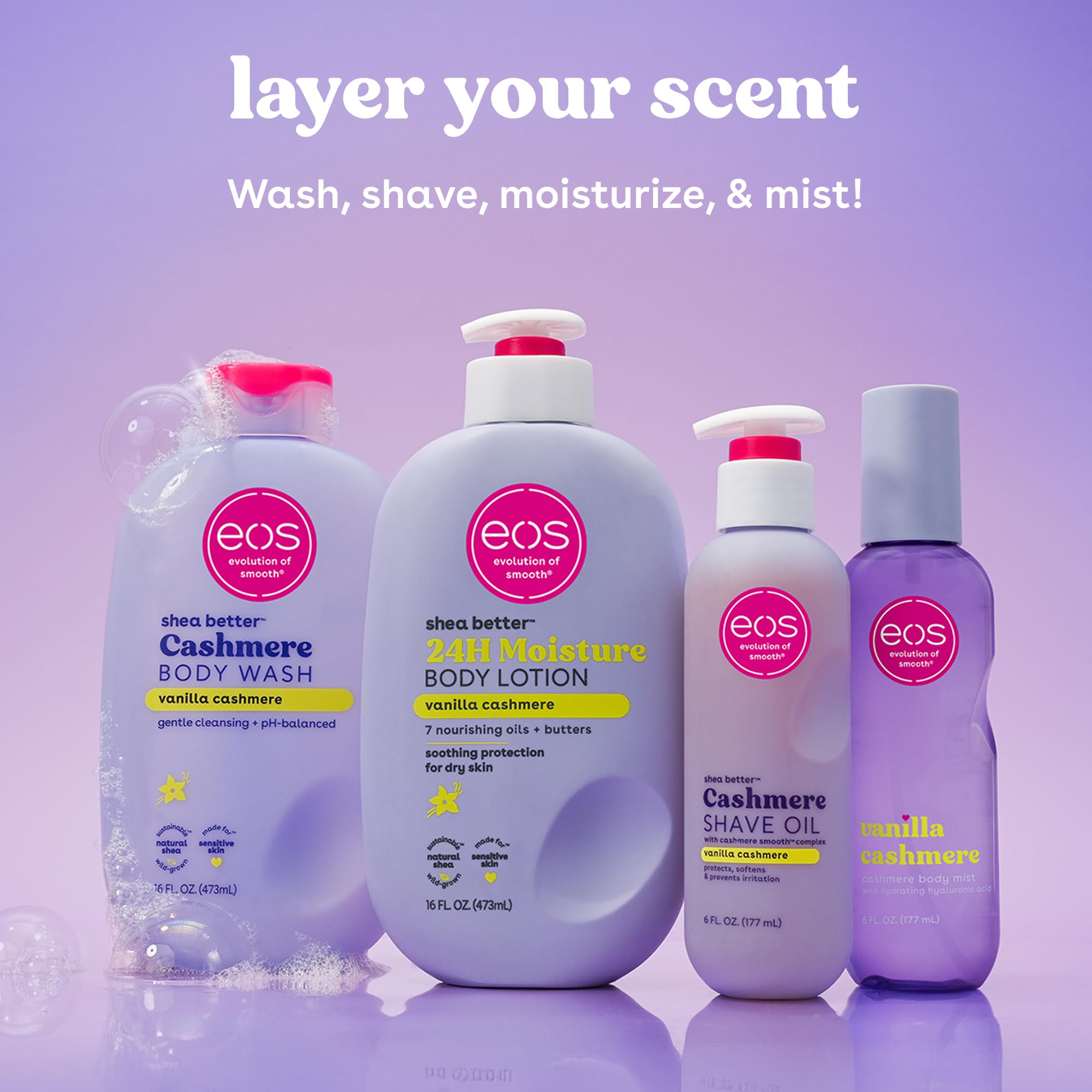 eos Vanilla Cashmere Shave Oil delivers a smooth, comfortable shave with a warm scent of whipped vanilla, soft musk, and cozy caramel. This lightweight oil-serum transforms shaving into a skincare ritual, delivering a close, cushioned shave and leaving skin cashmere smooth. Infused with a moisture-rich blend of shea butter, cocoa butter, coconut oil, and glycerin, the formula cushions and glides to help prevent irritation, nicks, and razor burn. Designed for sensitive skin and bikini area-approved. Complete your routine by layering with Vanilla Cashmere Body Wash, Body Lotion, and Body Mist for a long-lasting scent experience.