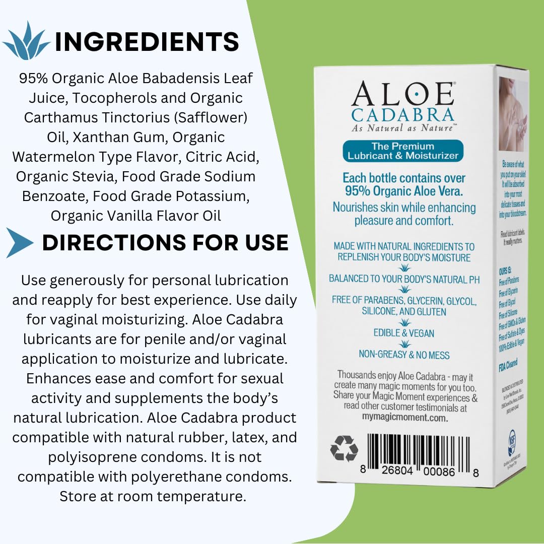 Aloe Cadabra's Flavored Lubricant is a premium water-based formula made to mimic your body's natural lubrication while moisturizing and invigorating a natural and lasting experience.