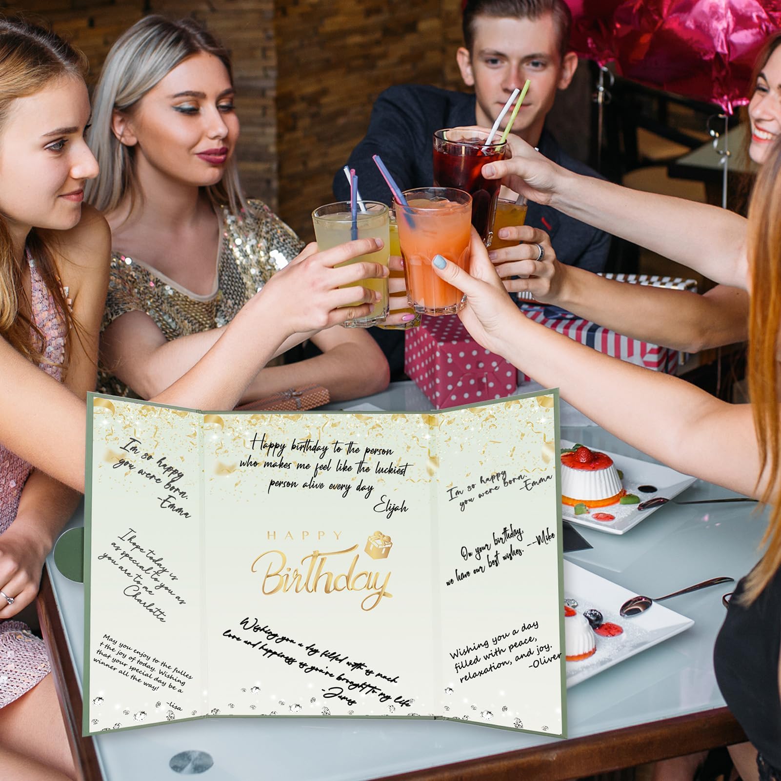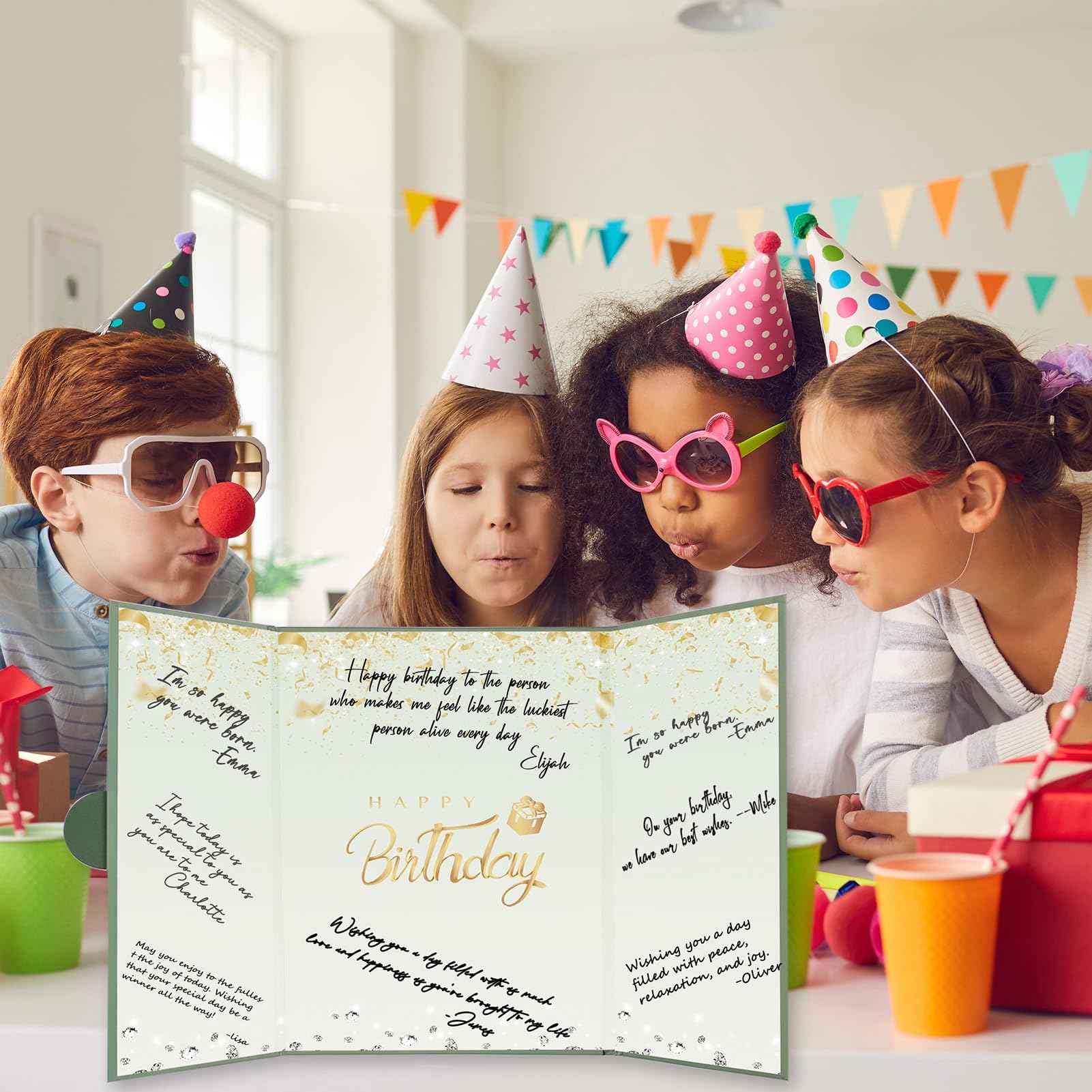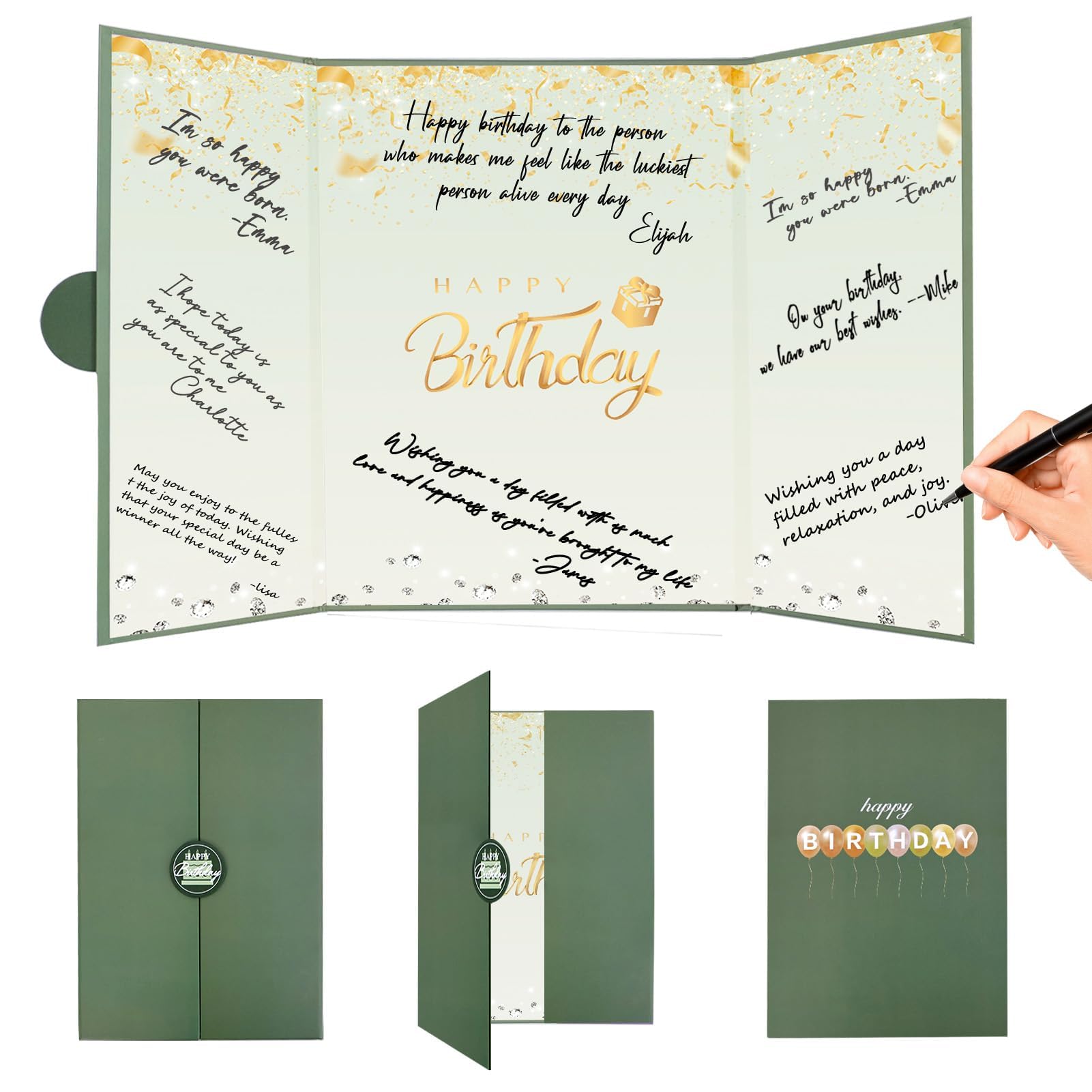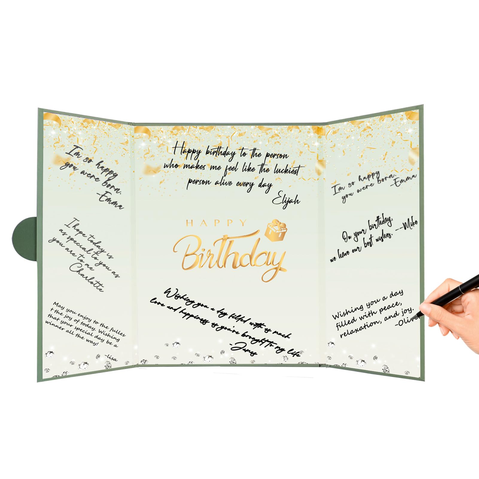 【Exquisite Design】- The green certificate has a badge on the cover, and the inside of the signature certificate is divided into three parts, the middle page is printed with the message 'Happy Birthday'. This green birthday signature guestbook can be opened directly and stand on the table. Tips: No pen.
