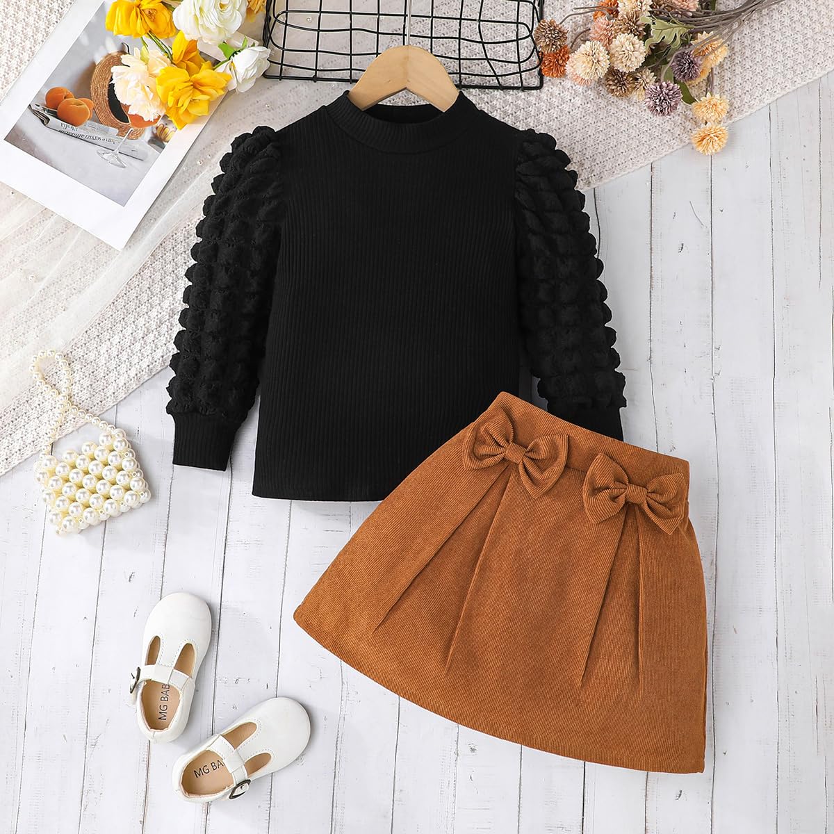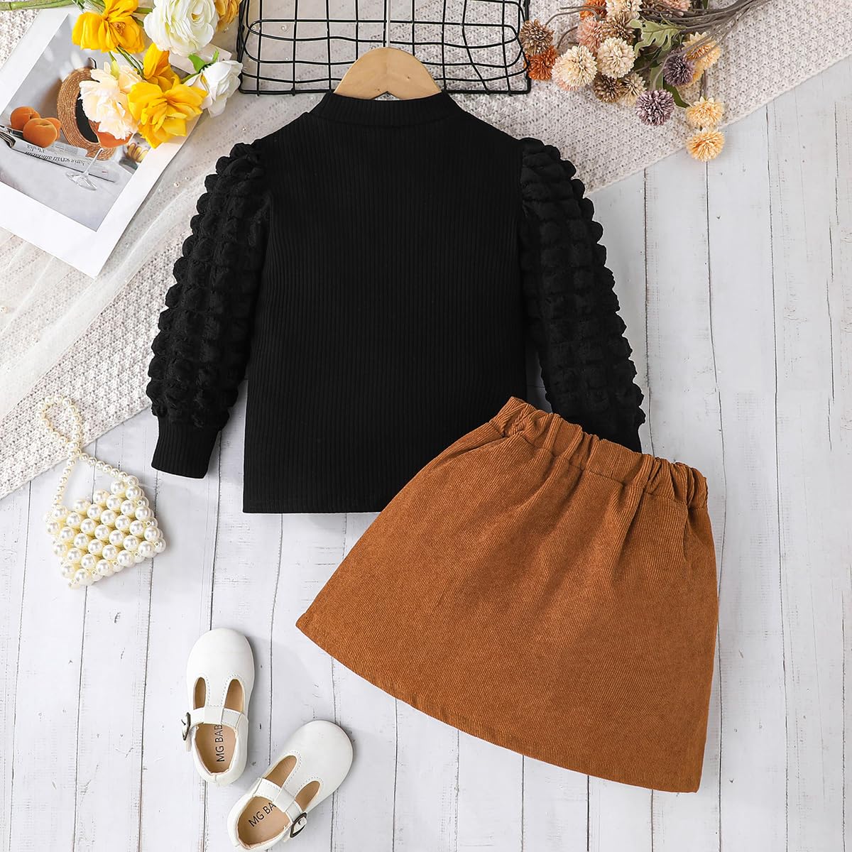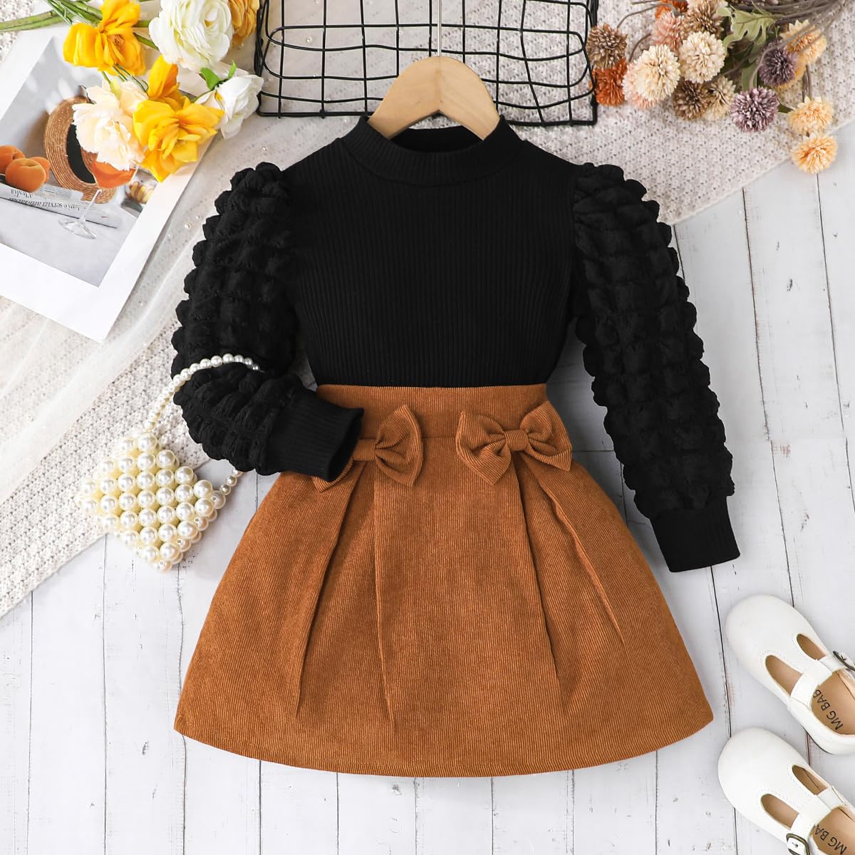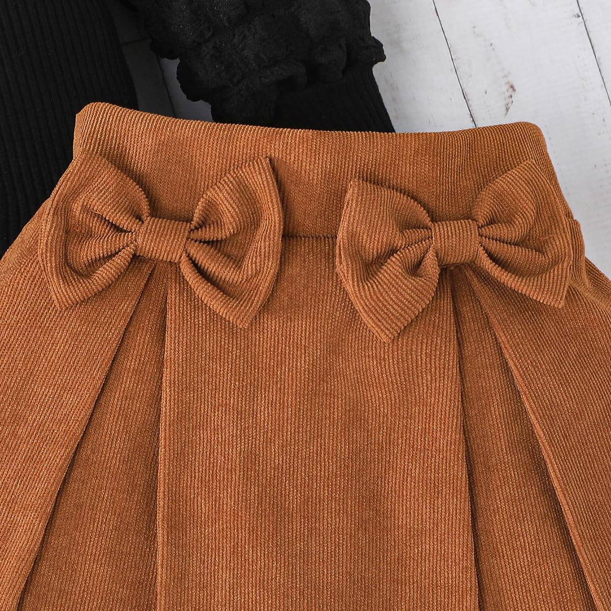 Feature:girl clothes, girl outfits,cute lantern puff sleeve,classic toddler girl brown skirt set ,comfy ribbed shirt and tweed plaid skirt set, girls corduroy skirt with delicate bowknot decoration,lovely and stylish, girls winter clothes,suitable for your little princess in autumn winter wear.